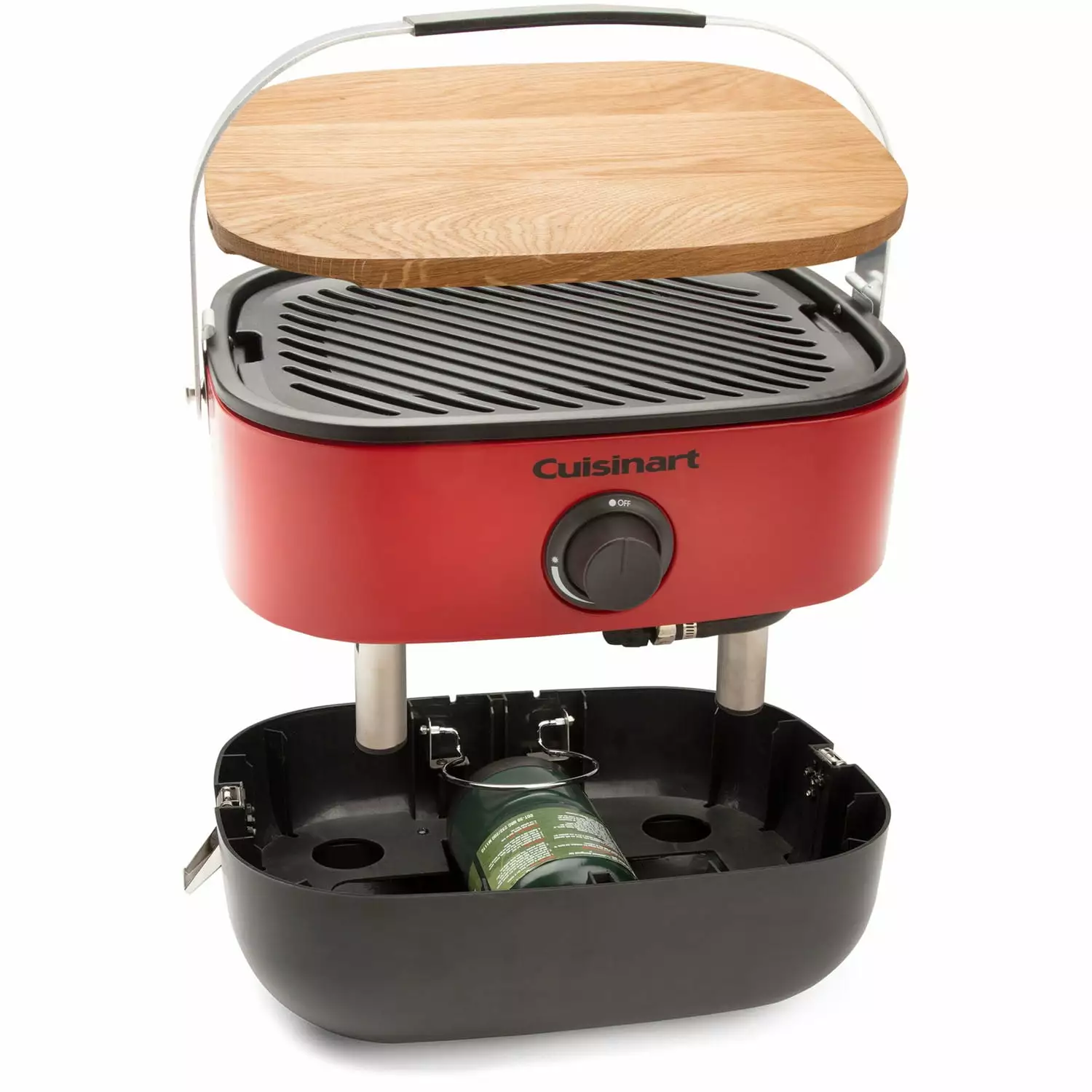 Calling all adventure seekers! The Cuisinart Venture portable gas grill is a versatile and compact grilling system that makes the perfect outdoor companion. The stack ‘n go design allows the grill to go virtually anywhere – from the beach. to a picnic. or on a boat – delivering the ultimate social grilling experience. Venture is your all-in-one portable gas grill that comes with a comfort grip handle for carrying. The wooden lid doubles as a chopping board. Simply remove the cutting board from the top to prepare your meal or use it for cheese and crackers to enjoy while sipping a glass of wine. The porcelain enameled cast iron grill grate gives off more heat and holds heat longer than steel. Simple. compact and complete. Cuisinart Venture is the perfect travel accessory for all your adventures.