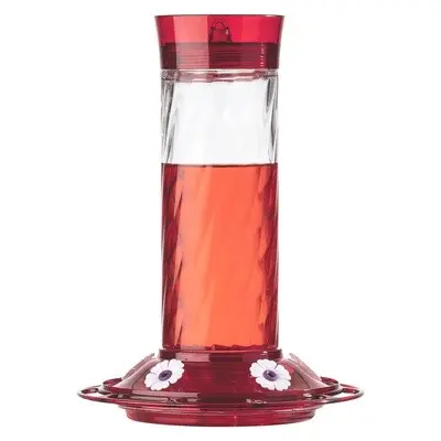 The More Birds Bird Health+ Diamond Hummingbird Feeder features soft ports and an integrated perch design that optimize the feeding angle and comfort for all species of hummingbirds. Hummingbirds easily feed from the 5 bee guard ports, but bees and wasps are stopped right in their tracks. The Diamond features a spiral, glass nectar bottle and a colorful red top and base. The wide bottle opening and detachable flat base make filling easy and cleaning a breeze. The built-in ant moat stops ants right in their tracks, keeping precious nectar fresh for hungry hummingbirds. With a 30 oz. nectar capacity, the Diamond provides plenty of nectar to keep hummingbirds happy and coming back for more! For best results, use More Birds Bird Health+ nectar, which simulates natural nectar found in flowers.