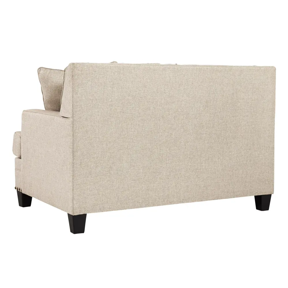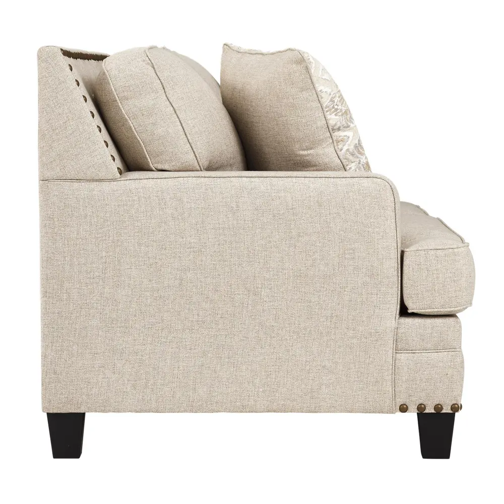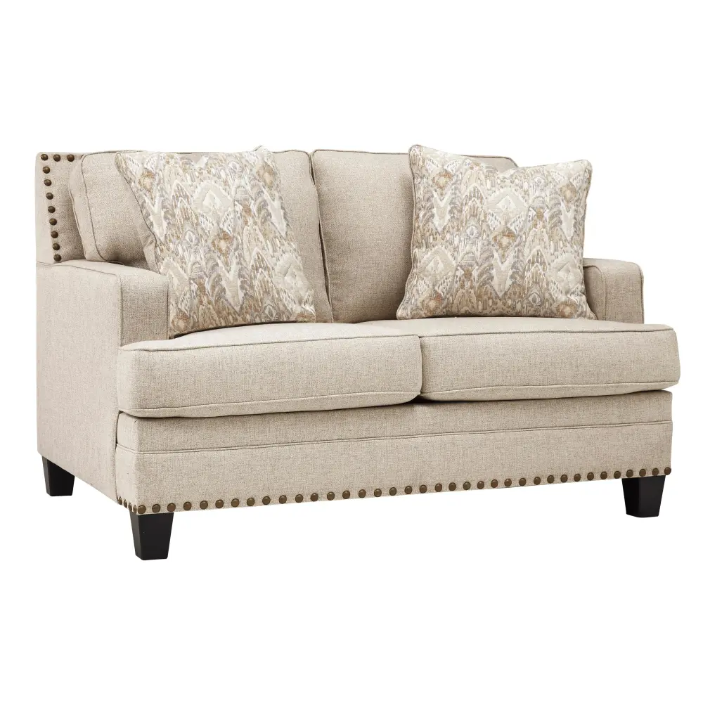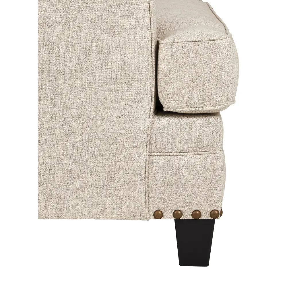 A case of contemporary and classic style influences coming together in a beautiful way, this loveseat in beige brings a fresh perspective to present-day farmhouse living. Distinctive elements include t-cushions that wrap around setback track arms, nailhead trim and a lovely linen-weave upholstery for an up-to-date feel. Muted hue designer throw pillows master the art of subtlety.