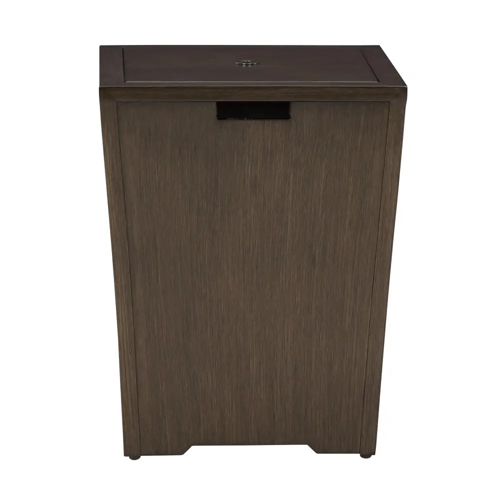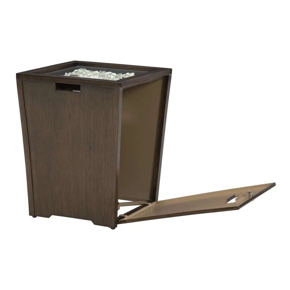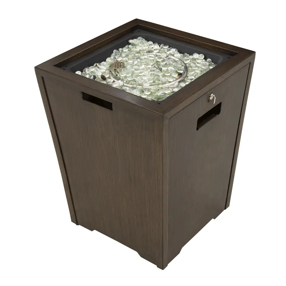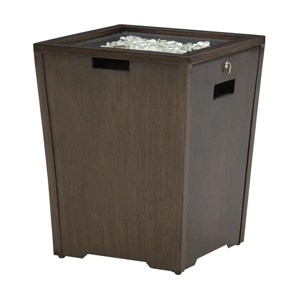 Sporting a hand-painted brown wood-look finish for a sense of earthy elegance, this fire pit table is sure to turn your backyard space into a hot spot for entertaining. The way its flickering flame seems to float on a bed of clear glass beads is truly mesmerizing. This outdoor fire pit, crafted with sturdy rust-proof aluminium and equipped with a burner cover and a polyester protective cover, will weather the seasons beautifully.