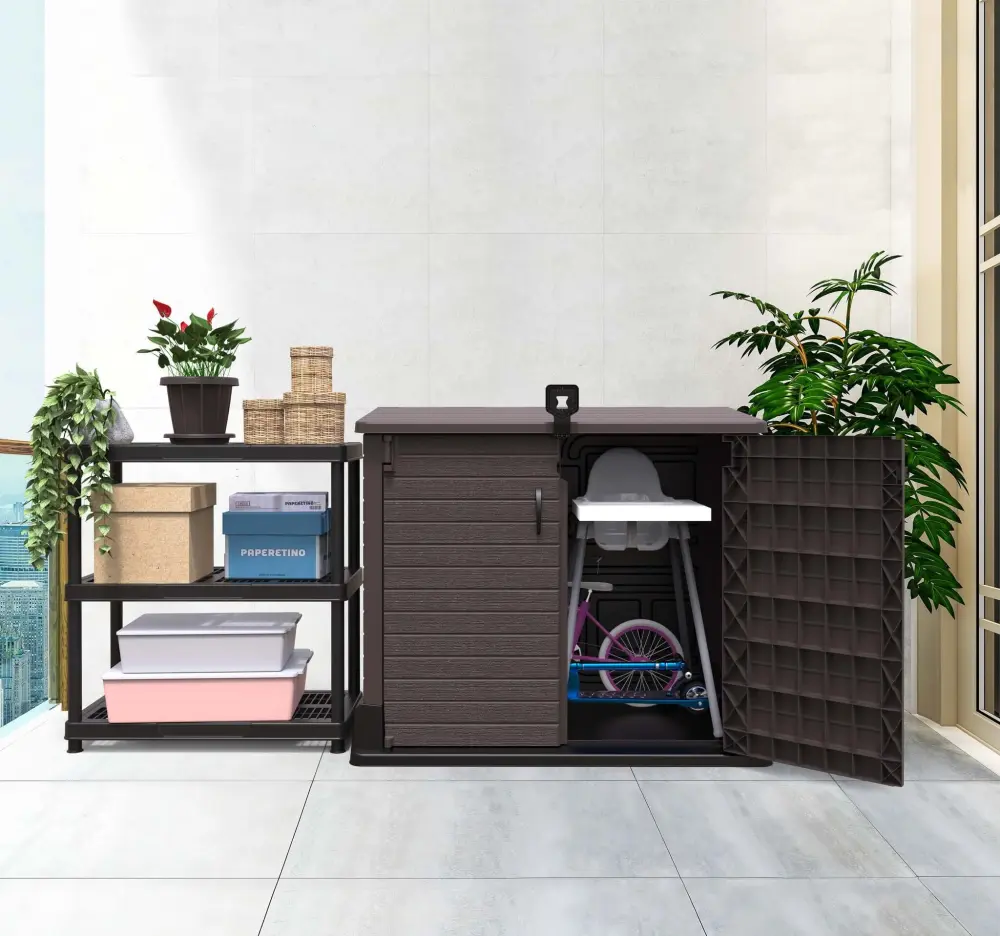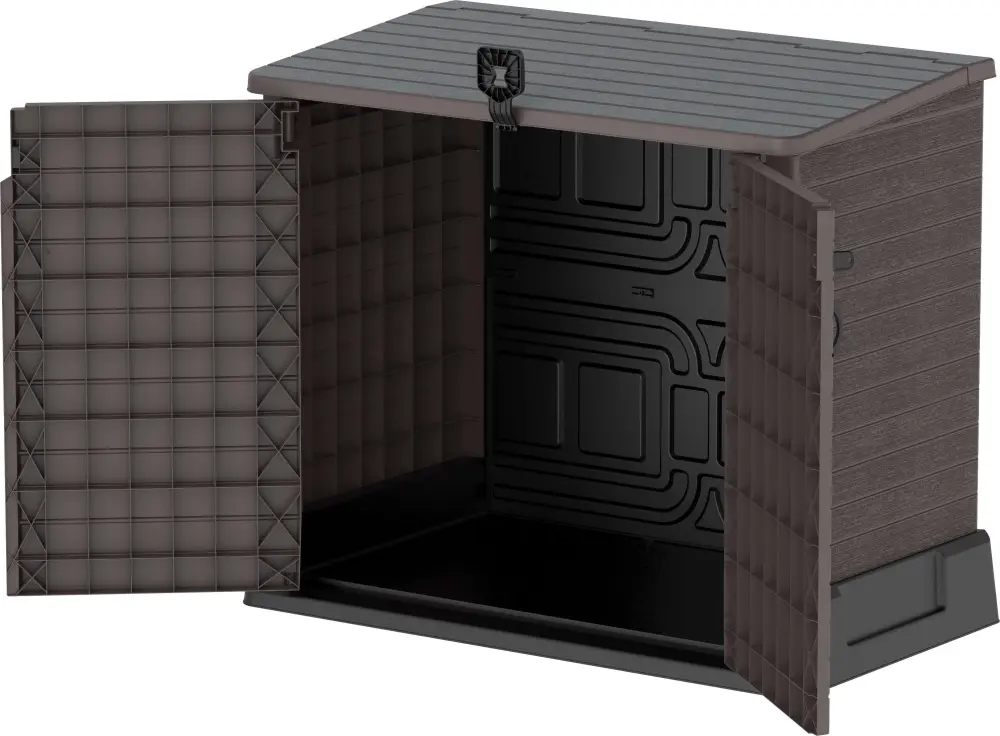 The Duramax Storeaway garden shed is thoughtfully crafted to provide ample storage for all your outdoor essentials, making it perfect for securely storing gardening tools, bicycles, BBQs, and much more. Constructed from high-quality, heavy-duty plastic, this shed is developed to withstand the elements with its weatherproof features and wide-opening doors that promote easy access and maneuverability. Say goodbye to the chaos of disorganized outdoor spaces this storage solution is exactly what you need! The Storeaway shed boasts an impressive 850L capacity and dimensions of 29” x 51.2” x 43”, offering generous space complemented by wide doors and a roof that optimizes storage capabilities. Ideal for everything from gardening supplies to maintenance equipment, its ergonomic and versatile design is built to meet all your storage needs. Unlike other storage options, the classic aesthetic and sleek ebony color of this shed allow it to seamlessly blend with any g