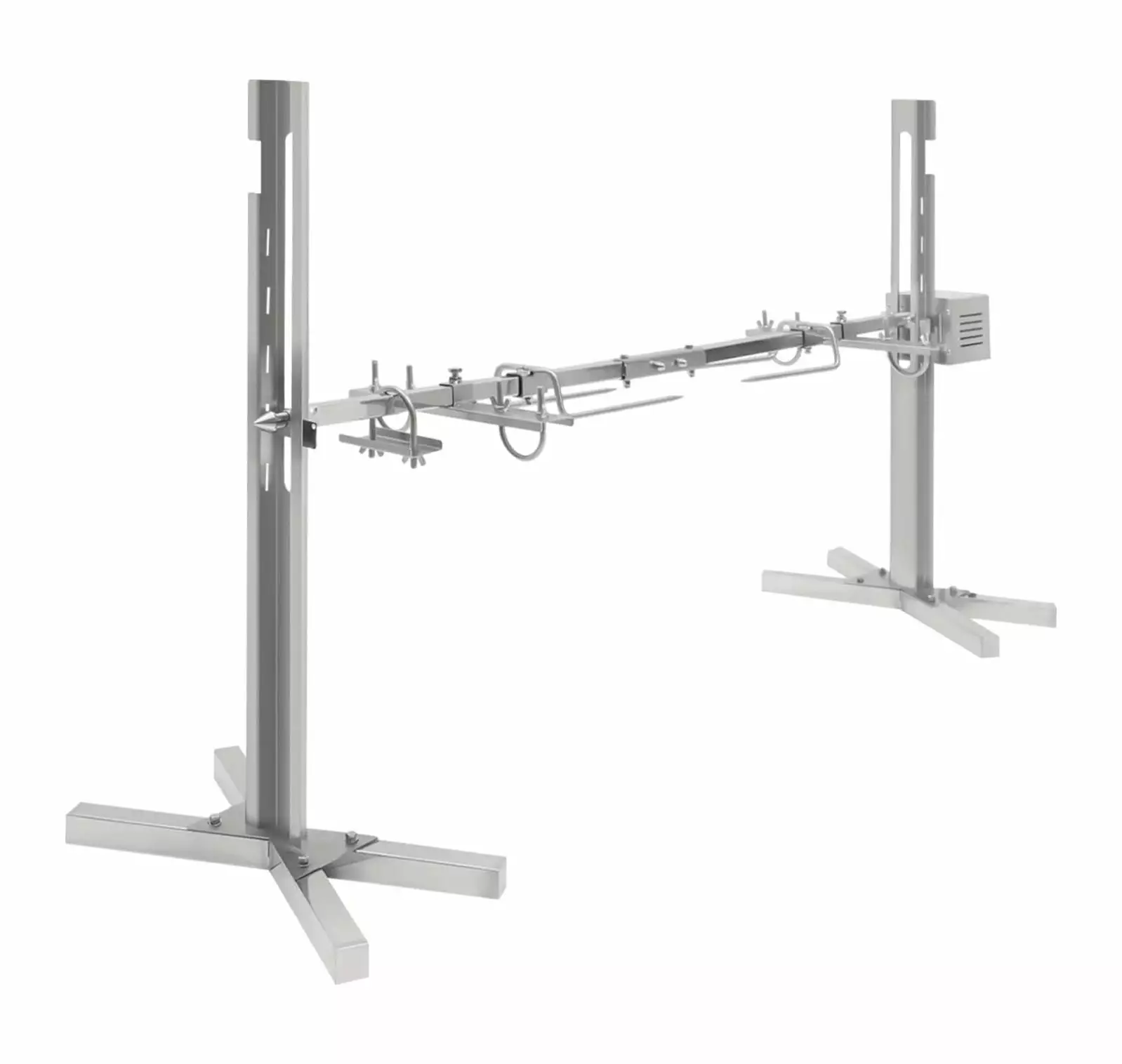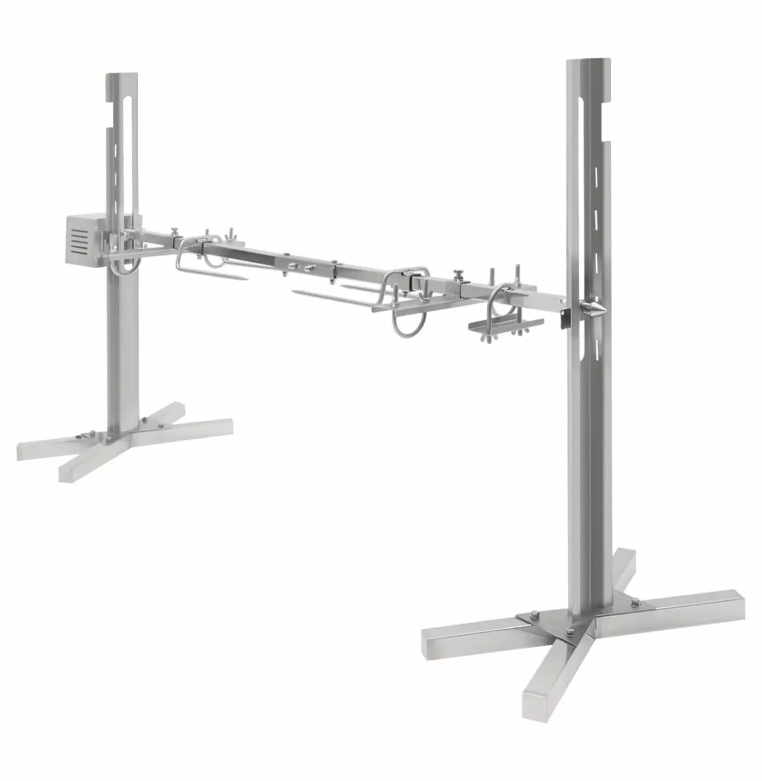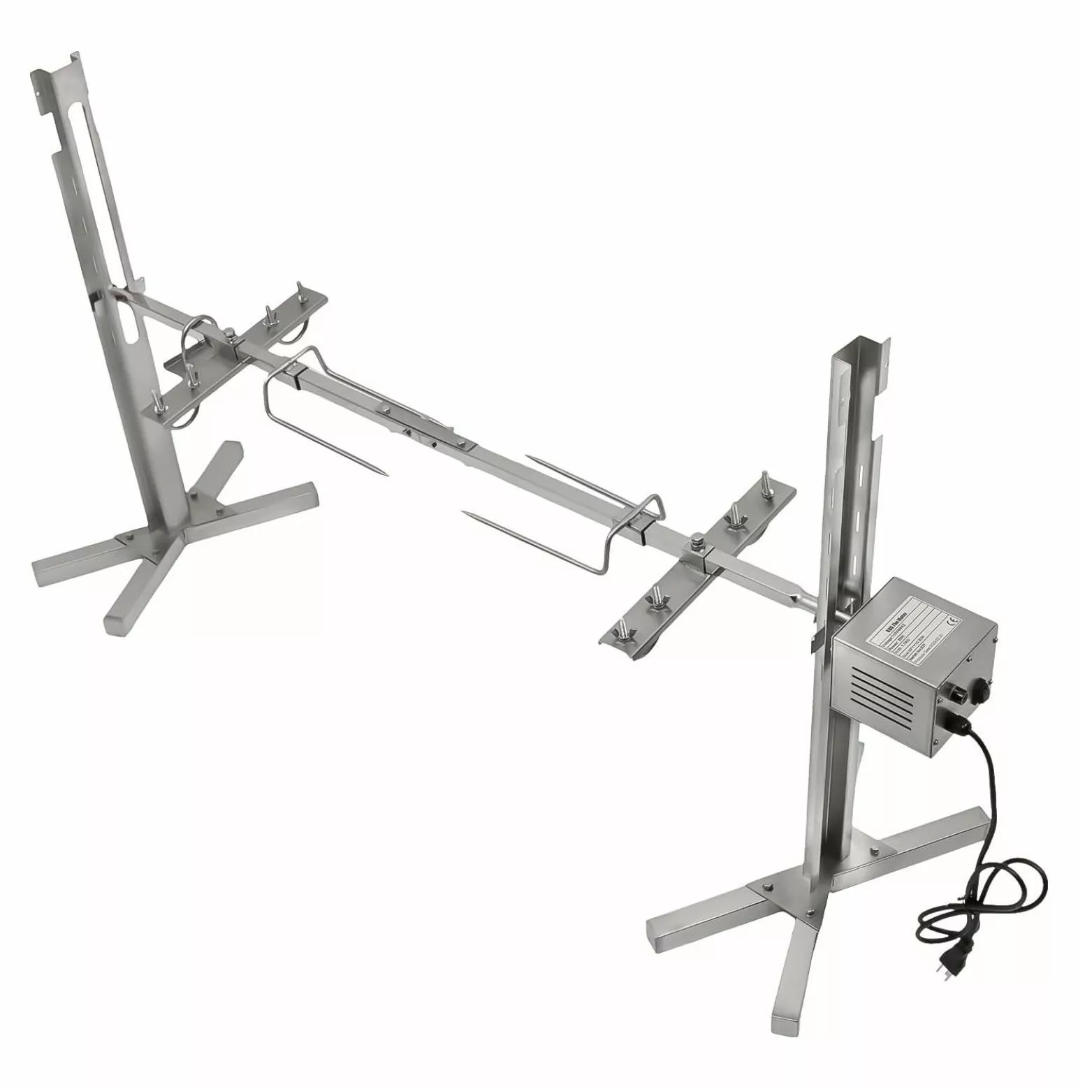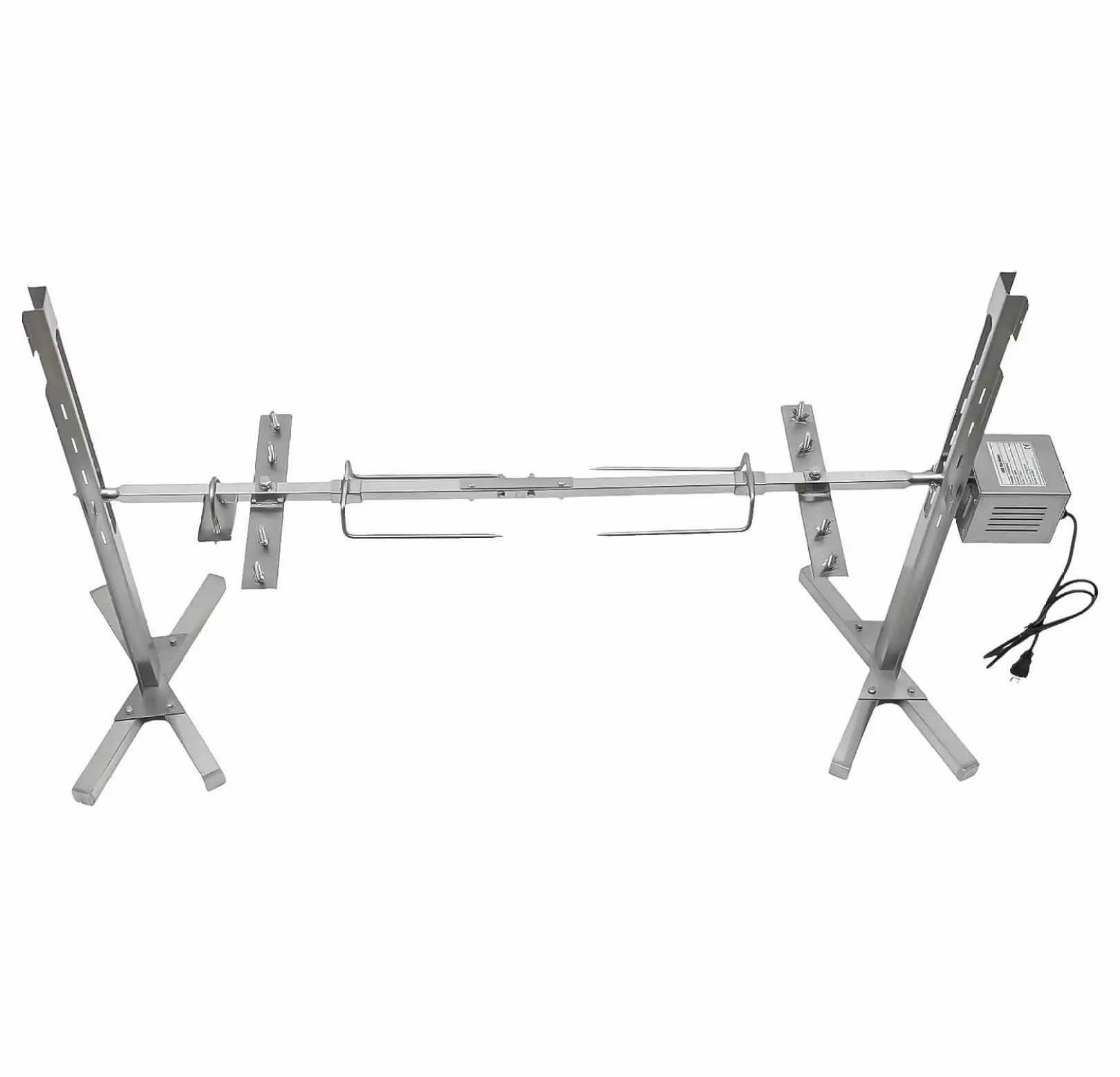 Adjustable Height The height of the electric rotisserie grill’s rod can freely be adjusted (five holes on each side). which makes it easy to control the distance between food and fire source to accurately grasp the softness and crispness of the food. Easy to Clean and Safe to Use The detachable design and smooth surface make it simple to clean. When it is dirty. you can use a wet towel or rinse with water directly. The electric rotisserie grill is equipped with a fuse. which can automatically stop in case of overload and short circuit. offering high safety. Details Package List 1 x Electric Rotisserie Grill 1 x English Manual All Accessories for Assembly Notes Please don’t get too close to the fire to prevent the electric rotisserie grill’s damage from high temperatures.Please don’t get the motor wet when washing the electric rotisserie grill. Specification Material Stainless Steel Surface Treatment Polishing Process Color Silver Voltage 110V Power 25W Plug US Standard Rotating Speed 2.5rmin Grill’s Rod External Diameter 20.93 mm 0.82 inch Grill’s Rod Adjustment Height 38 60.5 cm 14.96 23.81 inch Overall Max Bearing Capacity About 40 kg 88.18 lbs Net Weight 7.55 kg 16.64 lbs Product Size 136 x 39 x 75 cm 53.54 x 15.35 x 29.52 inch Wide Application The electric rotisserie grill can be used for grilling food such as fish. chicken. lamb. etc. in camping. birthday parties. weddings. etc