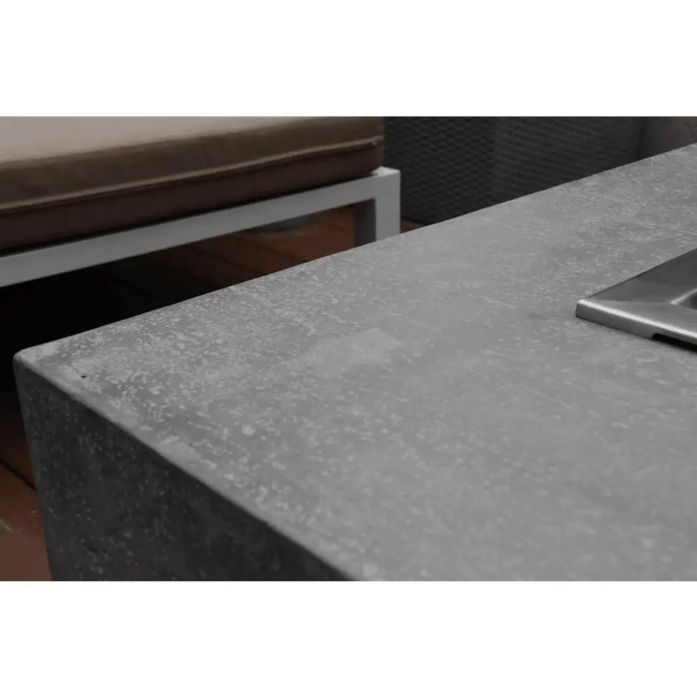 Create an iconic centerpiece for your outdoor seating area with the Hampton Rectangle Concrete Fire Pit Table. This durable cast concrete fire table features a vibrant, 45,000 BTU, 30-inch burner that evokes the sense of an inviting campfire. With coffee table-like styling, this low rectangular fire pit has a modern, minimalist look you’re sure to love. Organic gas fuels the center flames that come up through natural lava rock, while the table itself features a wide rim that conveniently accommodates drinks and snacks when the fire is not in use. The rectangular shape is great for outdoor sectionals and also pairs well with benches, chairs, and lounges for versatile setup options.