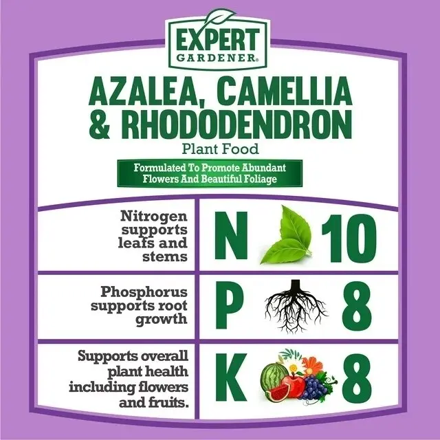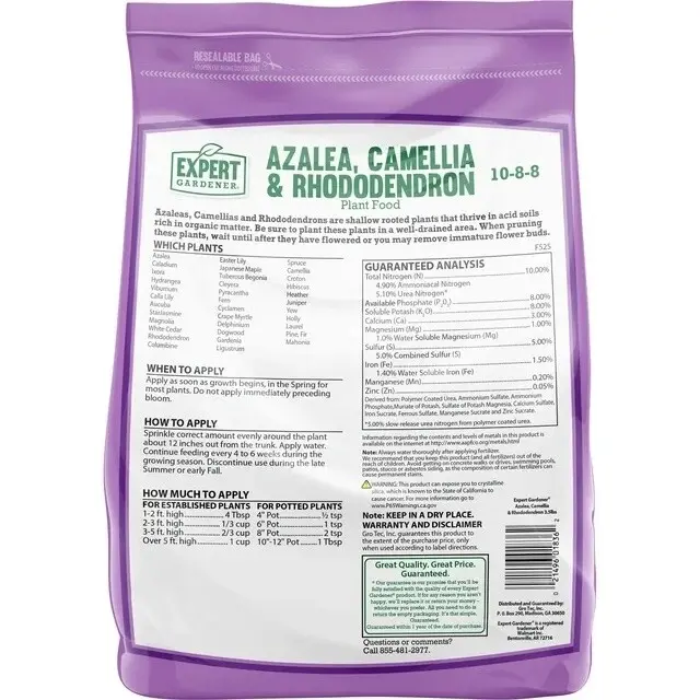 Expert Gardener plant foods, also called fertilizers, are made of immediate and slow release fertilizer granules to feed your plants immediately and to keep on feeding throughout the growing season for up to 3 months. Slow release fertilizer particles in Expert Gardener Azalea, Camellia & Rhododendron Plant Food have a protective coating that controls the release of nutrients into the soil over time. This combination of immediate and slow release fertilizers simplifies the task of feeding your Azaleas, Camellias & Rhododendrons! In addition to customized macronutrient levels of Nitrogen, Phosphorous, and Potassium targeting all types of Azaleas, Camellias & Rhododendrons; Expert Gardener Azalea, Camellia & Rhododendron plant food and fertilizer also contains a customized mix of micronutrients such as Calcium, Magnesium, Sulfur, Iron, Manganese and Zinc. Micronutrients are essential elements every plant needs but are used by the plants in smaller amounts than the NPK macronutrients. The macro and micronutrients in Expert Gardener Azalea, Camellia & Rhododendron Plant Food and Fertilizer is specially formulated to provide the right nutrients required for abundant flowers and beautiful foliage in your Azaleas, Camellias & Rhododendrons.