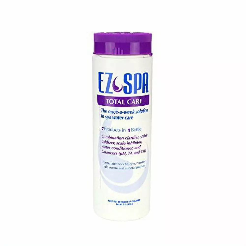 Taking care of your hot tub has never been easier thanks to the EZ Spa Hot Tub Total Care Weekly Water Chemical Treatment Blend. This hot tub chemical balancer is designed to work as a preventative treatment. Start using it with each fresh fill of the water and reapply once a week. Algae. sediment. and bacteria won’t find any foothold and your water will remain crystal clear. Total Care is a special blend of clarifyer. oxide. balancers. and more that prevents problems before they start. You’ll use fewer chemicals that are less harsh. meaning there won’t be any stinging of sensitive eyes. The spa water preventative care supply includes 2 pounds of Total Care. plenty to keep even the largest home hot tubs or spas ready for guests at all times. Make your life a little easier and let the EZ Spa Hot Tub Total Care Weekly Water Chemical Treatment Blend take total care of your hot tub. Note: This item cannot be shipped to California and will be cancelled/refunded if order is placed.