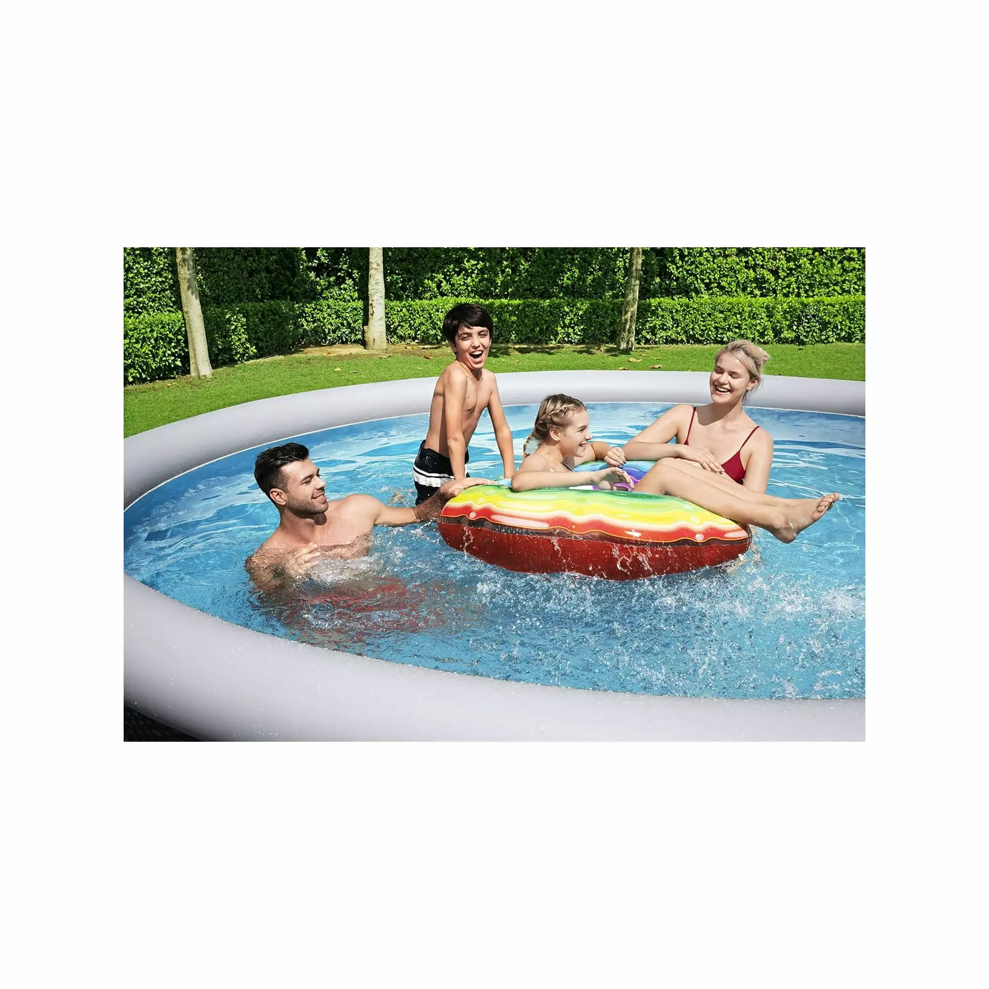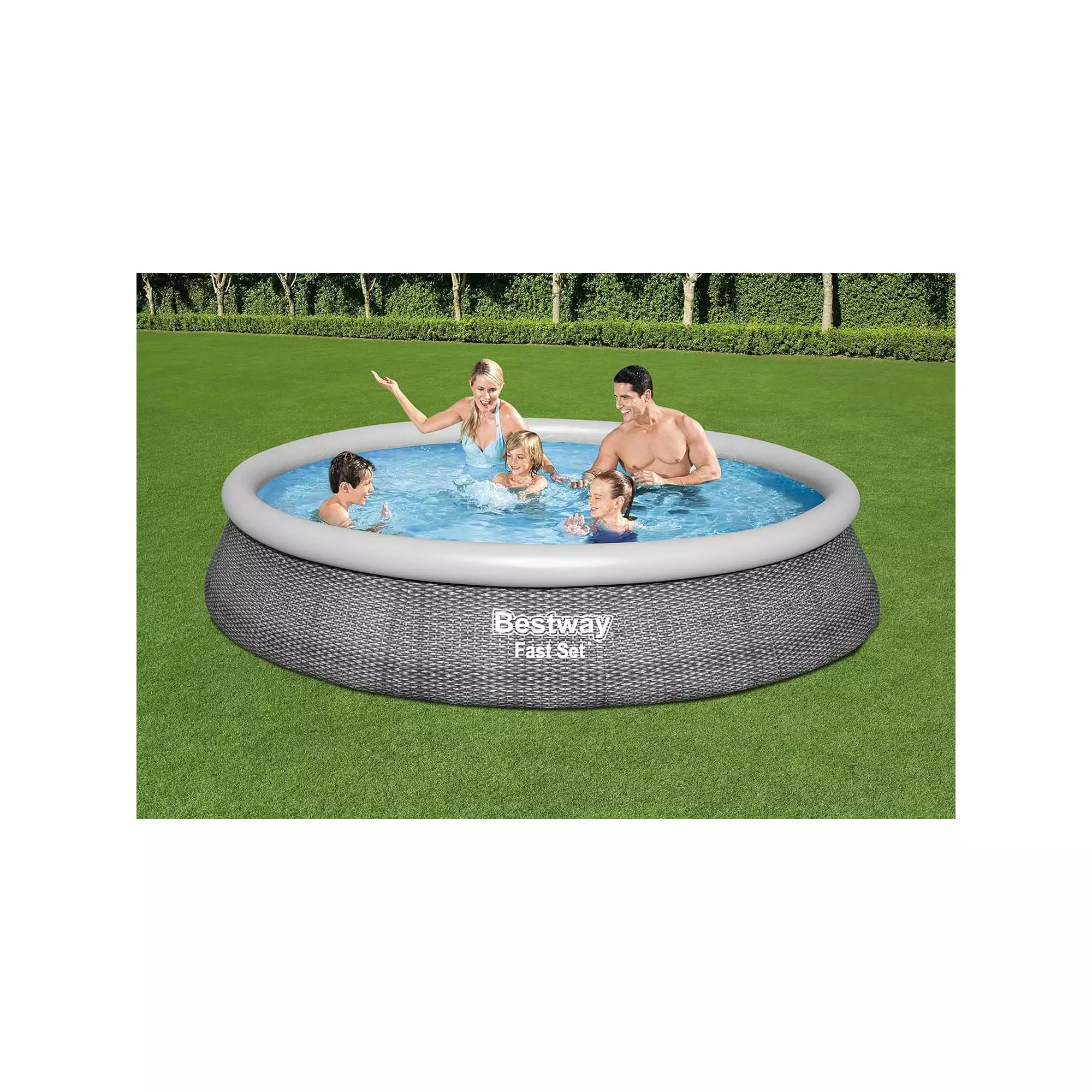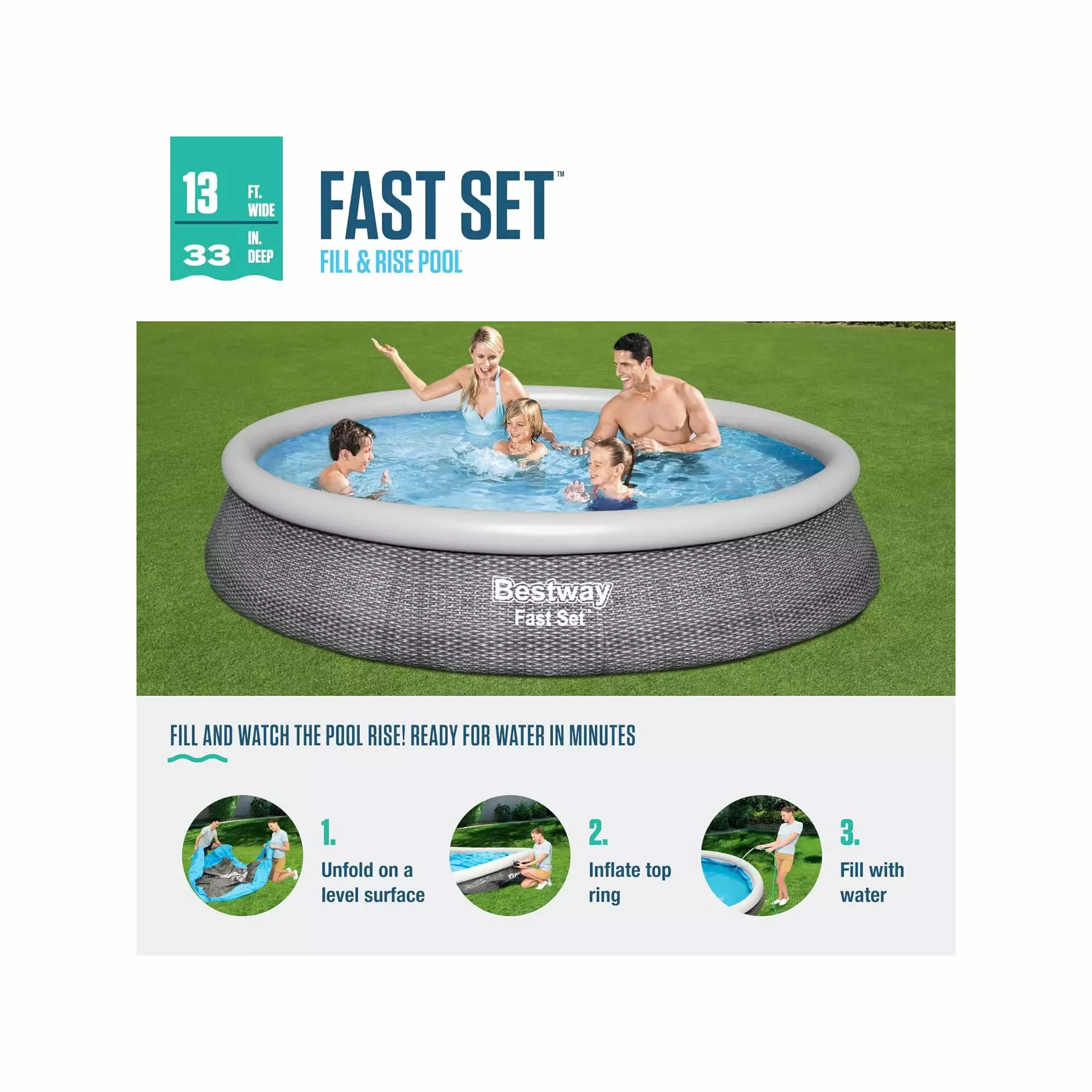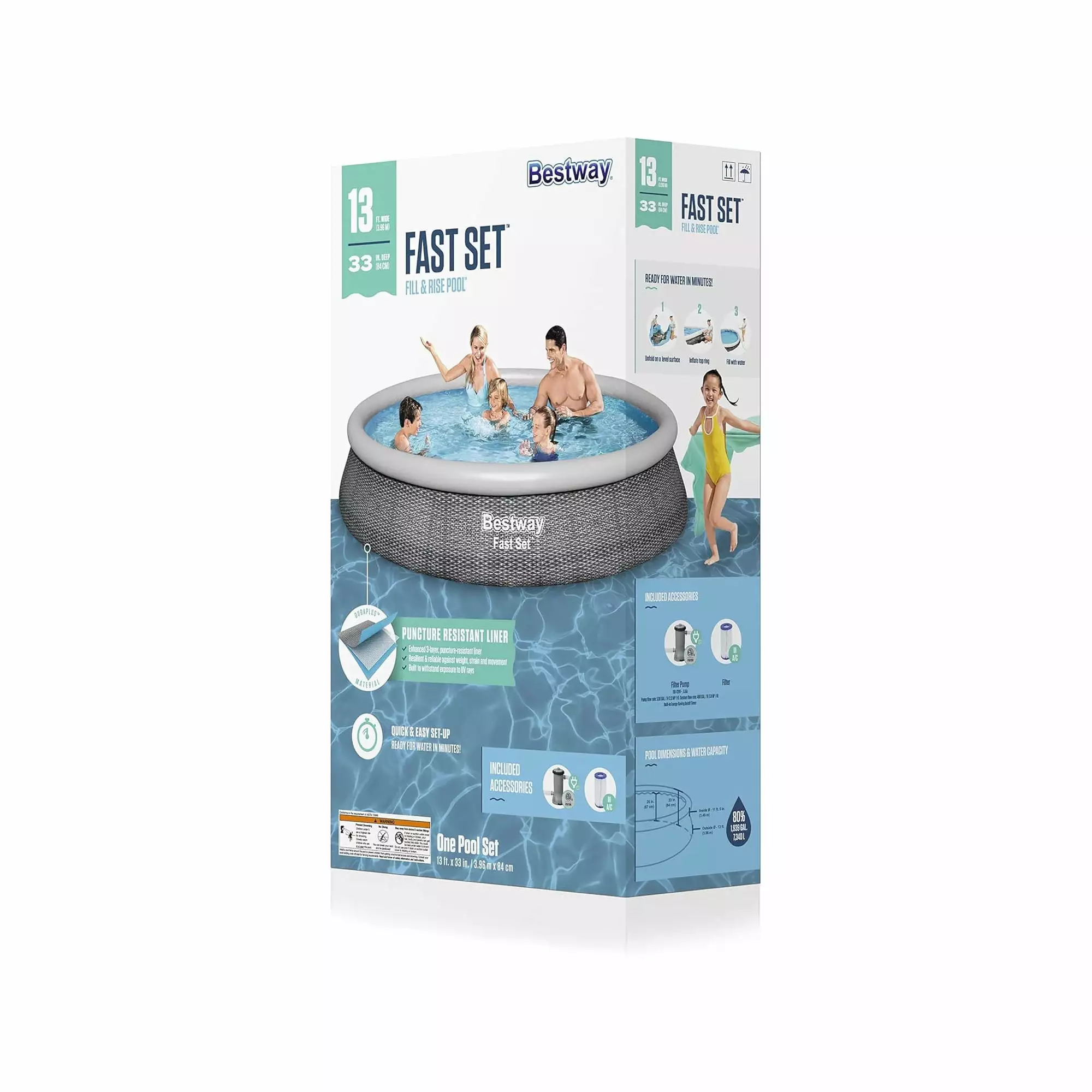 With this quick & easy Best way Fast Set Pool set. You’ll be ready for a pool day in no time! The process is simple – just select a level surface. inflate the top ring & the pool will rise as it’s filled up with water. The sturdy Tritech liner is made out of a durable material that is reinforced for strength & puncture-resistance. The attractive liner also has a realistic Rattan print that will bring a classy look & feel to your backyard. This pool set also comes with a filter pump to keep the water nice & clean. When the season’s over. storage is fast & Simple. The water releases easily through the flow control drain valve. & then the pool can fold up for compact off-season storage. Your summer won’t be complete without the Best way fast Set Pool!