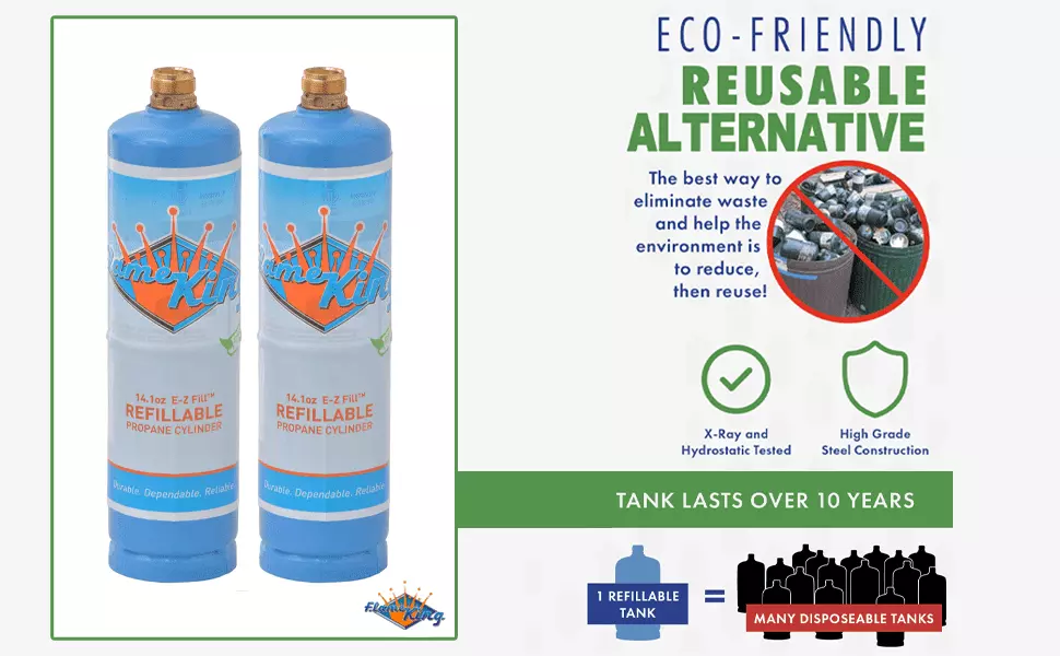 - REDUCE WASTE – Keep disposable propane tanks out of the environment by using Flame King 1LB refillable cylinders