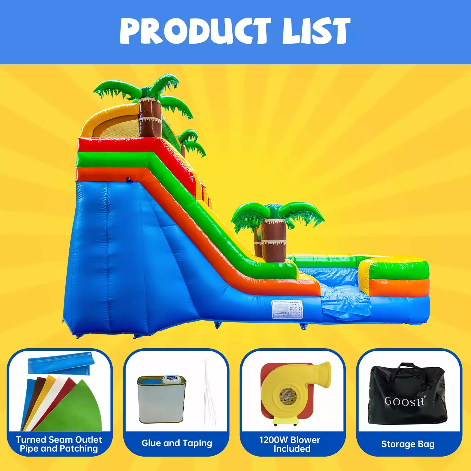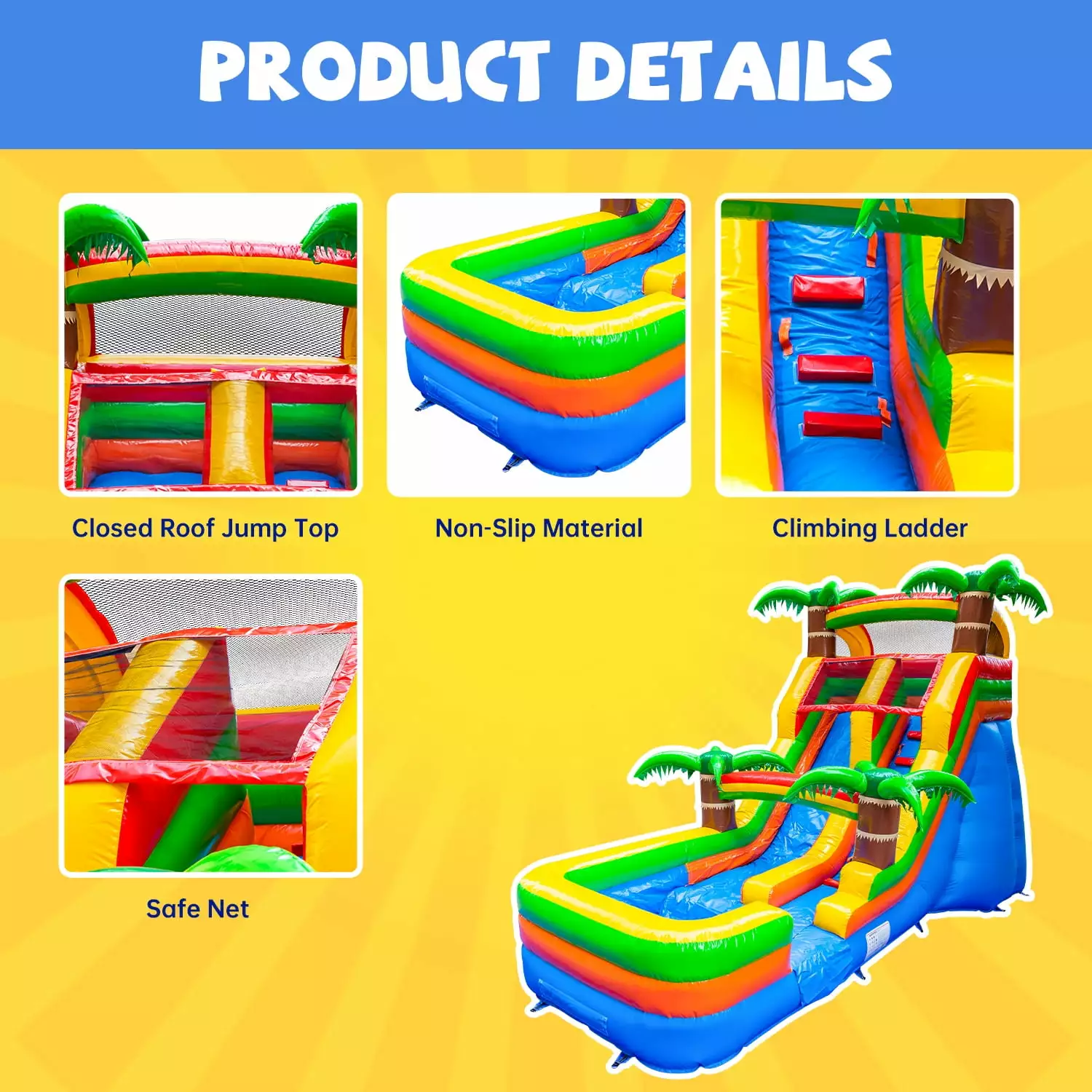This inflatable water slider with blower comes with an attached inflatable landing zone for wet or dry use. You kids could enjoy their summertime all day long. experiencing drills. climbs. shuttles. slides. jumps. and shoots with this commercial inflatable waterslide. They could climb from the built-in ladder on rignt side and slide down in the left into the pool at the end. A pool with an inflatable bumper in front of this inflatable slide helps kids land safely. Closed roof jump top and safe net are also designed to ensure your children’s safety while playing. Made of 16 OZ thickened PVC material. this blow up water slides for backyard is puncture-resistant. water-resistant. and can be used for a long time. greatly reducing the damage caused by children’s careless bumping. Certificated with ASTM&CPSIA&CPC standard. this inflatable water slides for kids is environment-friendly and safe for your kids. Design with double-needle thread sewing. this kids water slide can bear strong pressure and accommodate up to 6 people. Inflation is speedy and convenient with included 1200W powerful air blower. The attractive palm tree theme and bright color scheme are sure to attract the attention of everyone in your neighborhood.