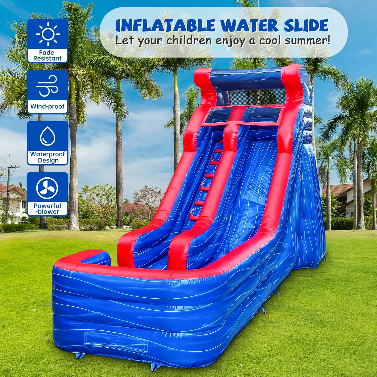 Whether you’re looking for the ultimate way to keep the kids entertained or want to be the cool house on the block. you’re sure to make a splash with this 16 FT inflatable water slide for adults. This inflatable water slide with blower includes one long slide. a climbing wall. and a splash pool. your kids could climb from the left side and slide down in the right. A pool with an inflatable bumper in front of this inflatable water slides for big kids and adults helps kids land safely. This water slides inflatables are made of 16 OZ thickened PVC material. ensures it is puncture-resistant. water-resistant. and can be used for a long time. Design with double-needle thread sewing. this inflatable water slides for kids with blower can bear strong pressure and accommodate up to 2 people. Certificated with ASTM&CPSIA&CPC standard. this blow up water slide is environment-friendly and safe for your kids. Inflation is speedy and convenient with included 1500W powerful air blower. Overhead netting prevents kids from jumping from the top of the inflatable water slides for pool. Children can experience drills. climbs. shuttles. slides. jumps. and shoots in any way. so that the body can be fully exercised.
