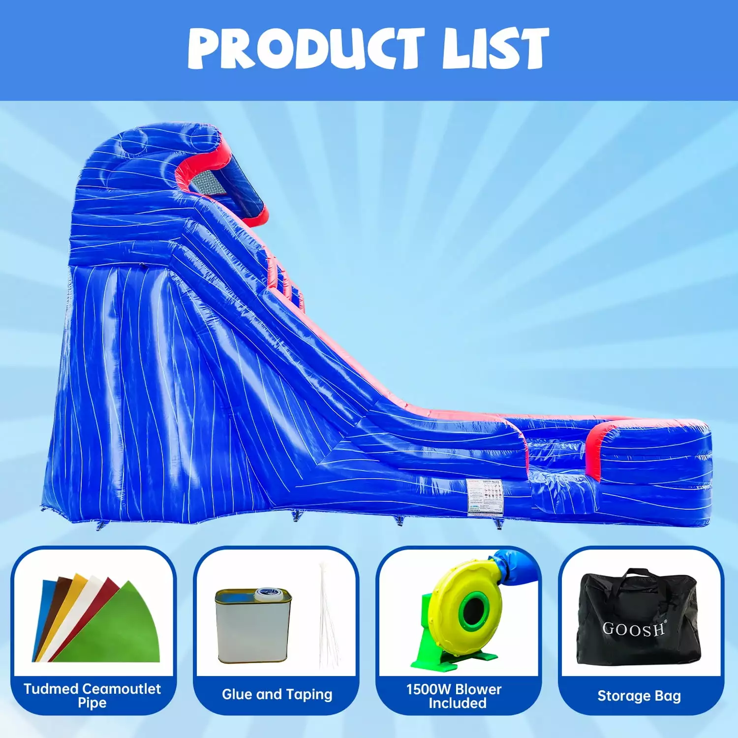 - Includes: water slide inflatable. air blower. storage bag. repair kit. glue. taping.