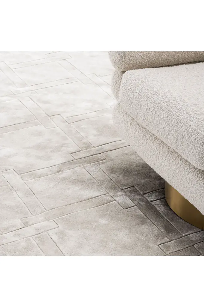 There��s nothing quite like the soft feel under your feet when you walk on a plush carpet. Hand woven from 100% viscose pile, the gray Carpet La Belle has a velvety texture. It is beautiful, noise dampening and very comfortable.