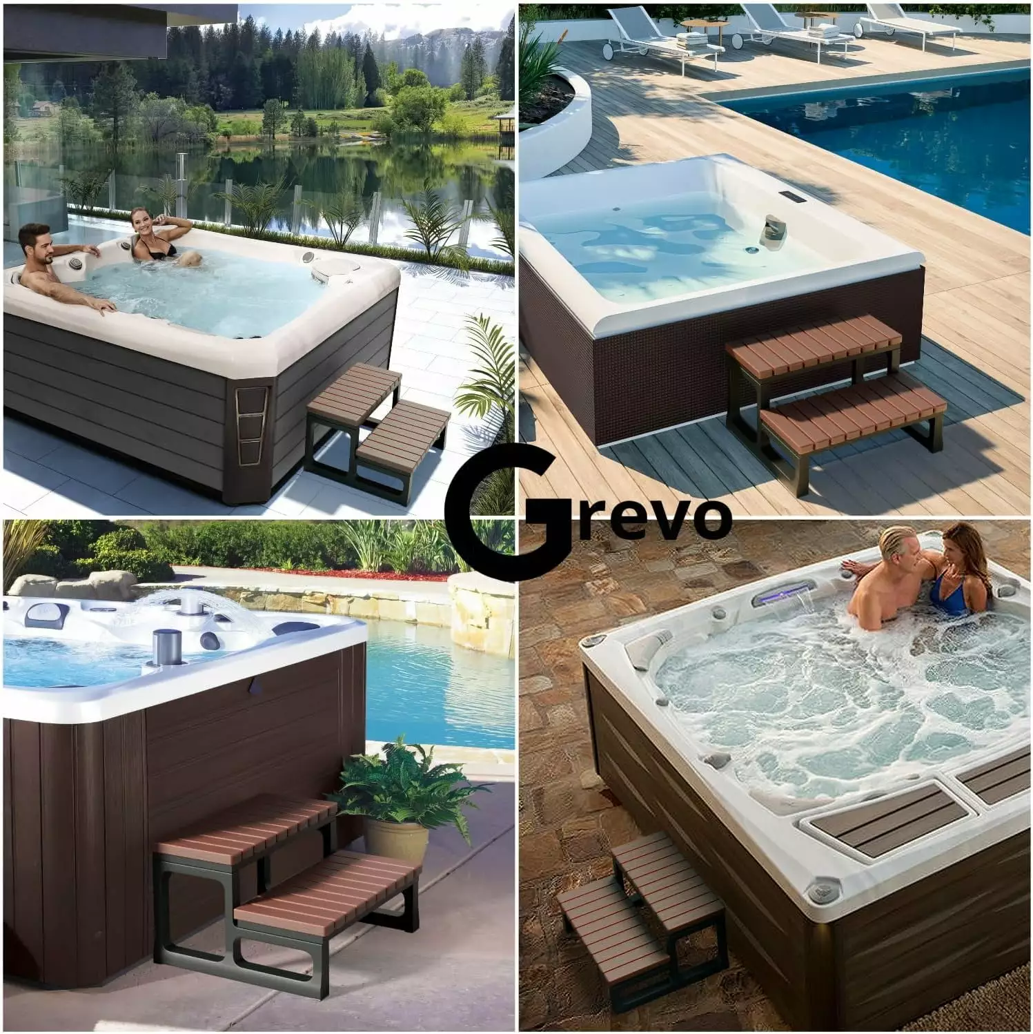 - The GREVO plastic outdoor steps are crafted for ease of use in close proximity to a jacuzzi. pool. both indoors and on the hot tub deck. or as patio steps / garage steps. Additionally. hot tub stairs serve as a portable steps for reaching high cupboards or accessing elevated spaces such as tall campervans.