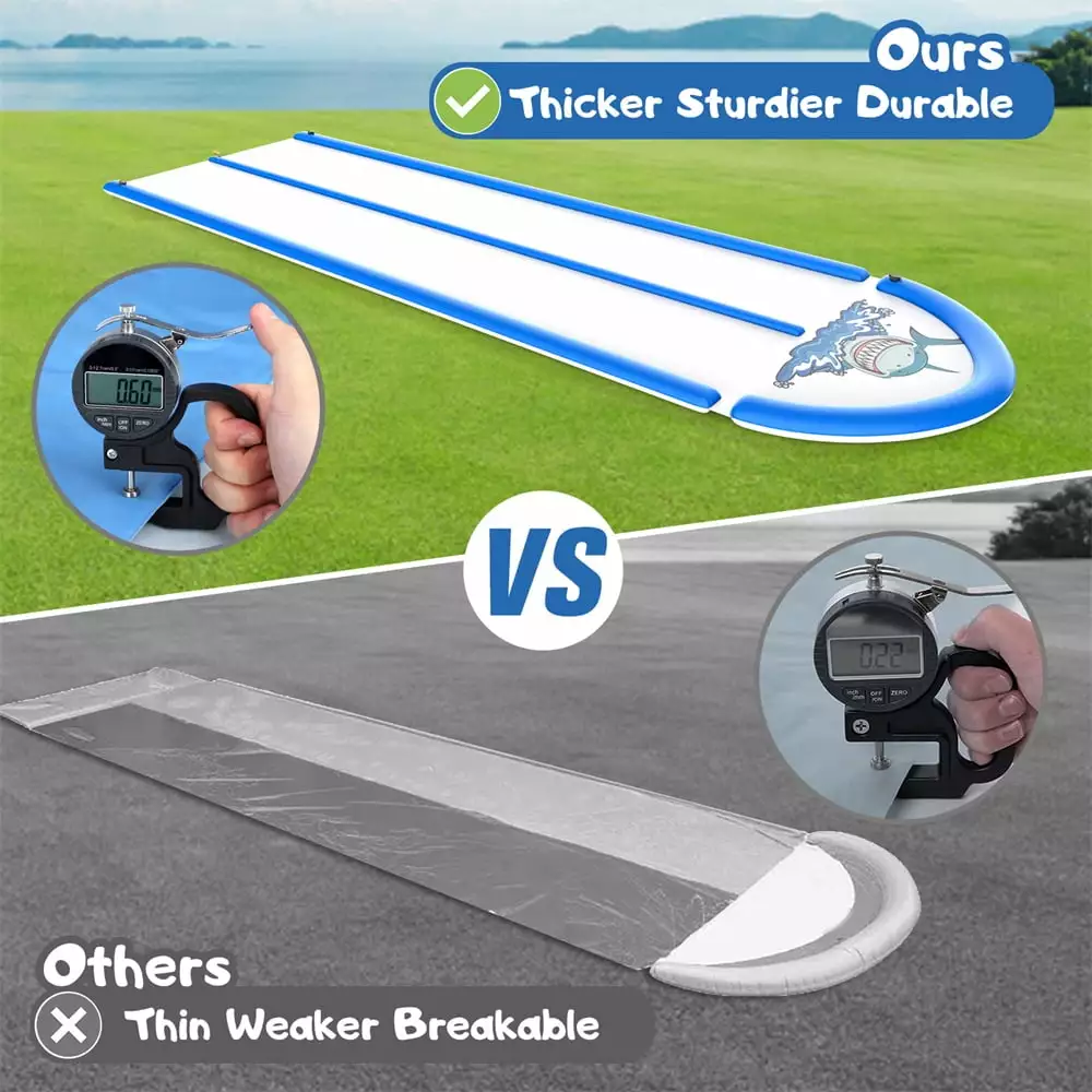 - Durable And Long Lasting : Crafted to surpass customer expectations. our slip and slide features a center sprinkler. double side fences. 2 bodyboards. slide races. and an end buffer made of premium thickness PVC material. Our lawn tarp slide is thicker and stronger compared to most lawn water slides available. ensuring that it won’t easily tear apart even with repeated use.