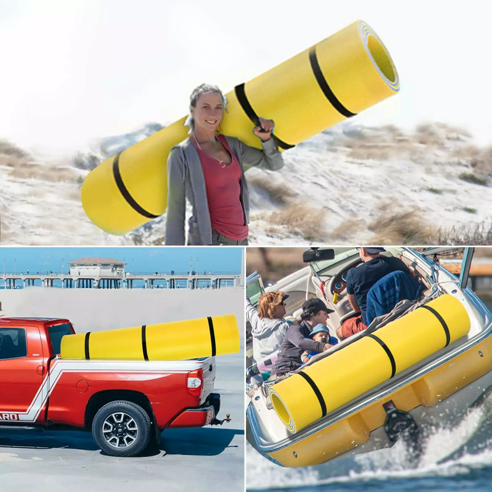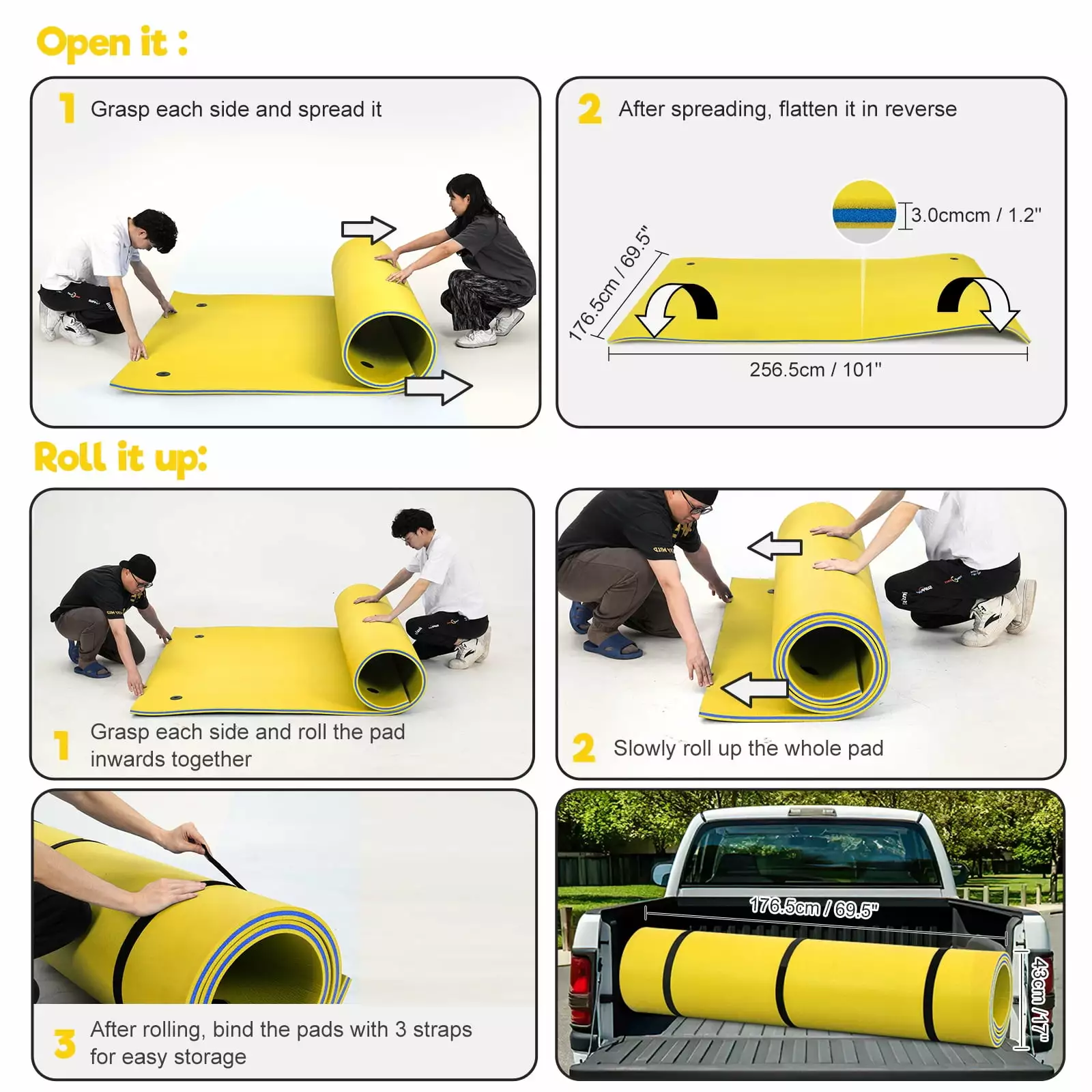Rolls Up for Easy Storage — At just 10.6 lbs of weight. this floating water pad is lightweight and easy to move and carry around. It comes with 3 storage straps that hold the pad together when rolled up for easy transport. carrying. and storage. The space-saving design allows you to store it anywhere when not in use.
