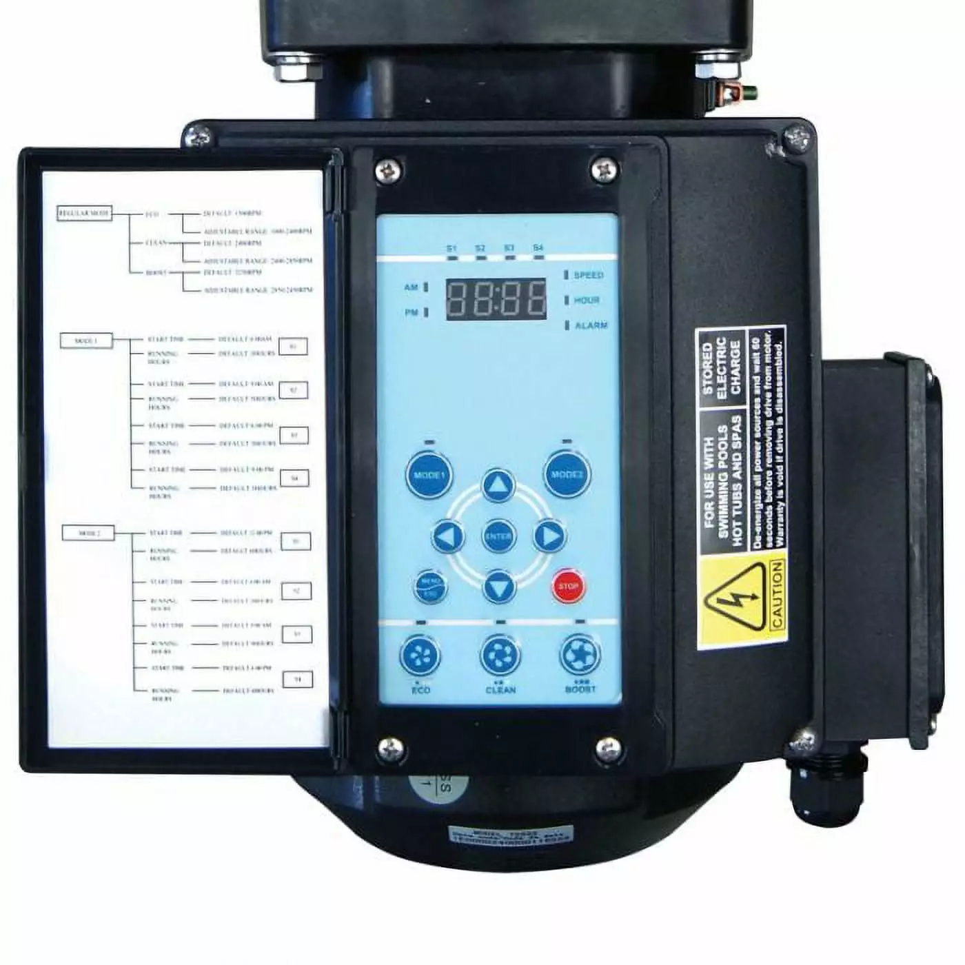 This variable speed pump is designed to operate your swimming pool filtration system as well as your spa. waterfall. cleaner. heater. salt chlorine system and other water applications. Using the control panel. you can run your pump on one of three scheduled programs; Regular mode. Mode 1 (16 hours for each clean cycle) and Mode 2 (24 hours for each cycle). The control panel also has LED indicators for speed as well as alarm indicators and error messages to warn the user against under and over voltage. high temperature. over current and freeze protection.