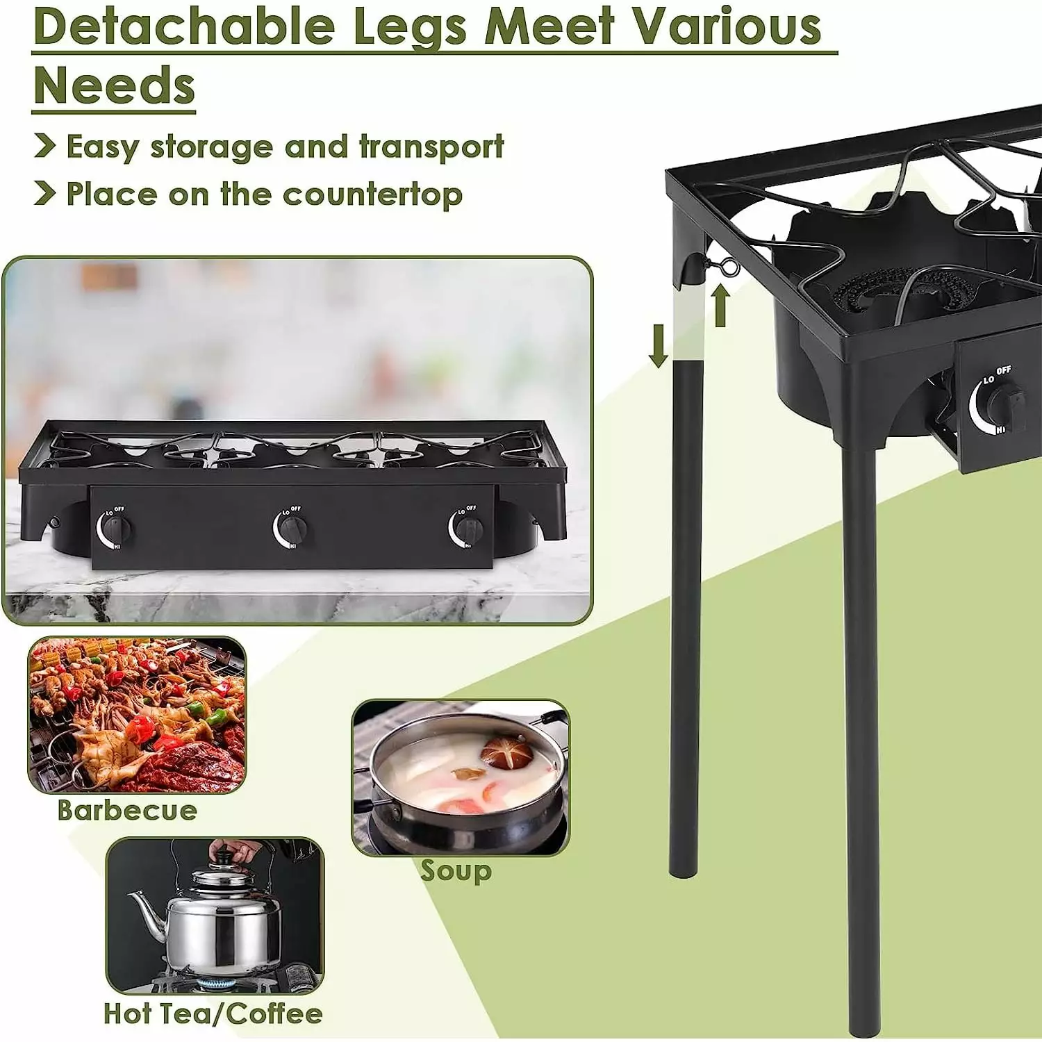 - Space-Saving & Portable Design The legs of this propane gas stove are detachable to fit more use situations. If needed. you can put the above stove part on any countertop for a comfortable height. Moreover. removable legs make the portable stove easier to take outside and store.