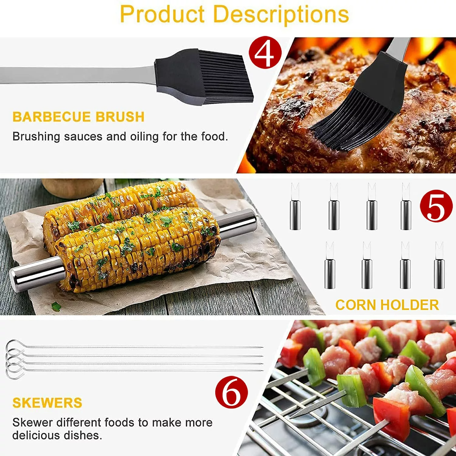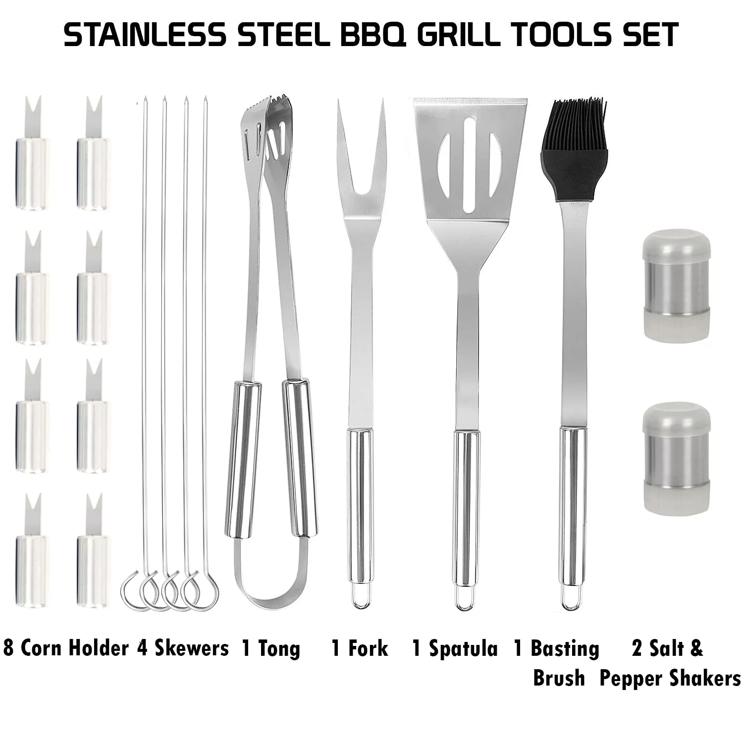 - 18 Pcs COMPLETE GRILLING SET – This BBQ Grill Tool Set by HOKIPO contains 1 BBQ Tong. 1 Spatula. 1 Fork. 1 Basting Brush. 4 BBQ Skewers. 8 Corn Holder. 1Salt Shaker and 1 Pepper Shaker