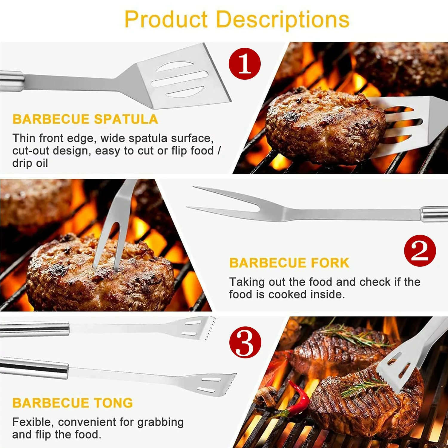 - PREMIUM QUALITY – Each barbeque tool is made from heavy duty stainless Steel.