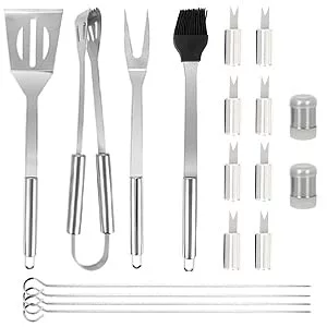 Introducing the HOKIPO 18 Pcs Heavy Duty Stainless Steel BBQ Tools Kit. the ultimate companion for your next outdoor grilling adventure. This premium grilling accessory set is designed to elevate your BBQ game and make every cookout a success. With its durable construction and versatile tools. it’s perfect for both novice grillers and seasoned BBQ enthusiasts.Crafted from high-quality stainless steel. these BBQ tools are built to withstand the rigors of intense heat and heavy use. The set includes essential grilling utensils such as a BBQ tong. skewers. fork. basting brush. spatula. corn holder. and salt & pepper shaker. ensuring you have everything you need at your fingertips.