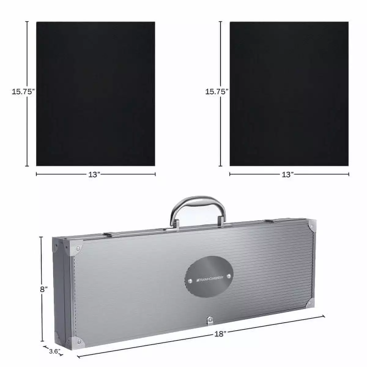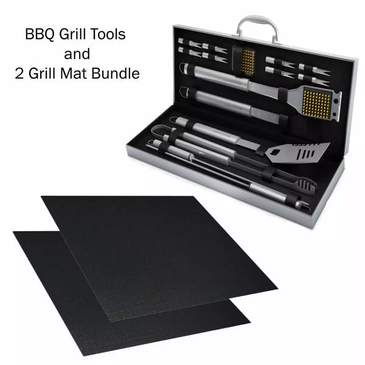 The 18-Piece Grilling Accessories Kit by Home-Complete has all the essentials you need for a successful summer cookout. The BBQ tool set is made from high quality and durable stainless-steel and is rust-resistant for lasting reliability. The 16-piece grill utensils set includes a variety of BBQ accessories like a spatula with built-in bottle opener. tongs. 2 skewers. 8 corn holders. a wire cleaning brush with an extra cleaning brush head. and a grill brush for basting. The grill set also comes with a heavy-duty aluminum carrying case to hold all your grilling utensils for storage or travel. Included in this BBQ set bundle. you receive a 2-pack of reusable grill mats. great for grilling small foods like vegetables. fruits. and seafood. These non-stick mats are FDA approved. can be cut to match any grill length. and are dishwasher safe. This grill kit is the perfect gift for the avid griller. or for occasions like Father’s Day. birthdays. wedding showers. groomsman gifts. and more.