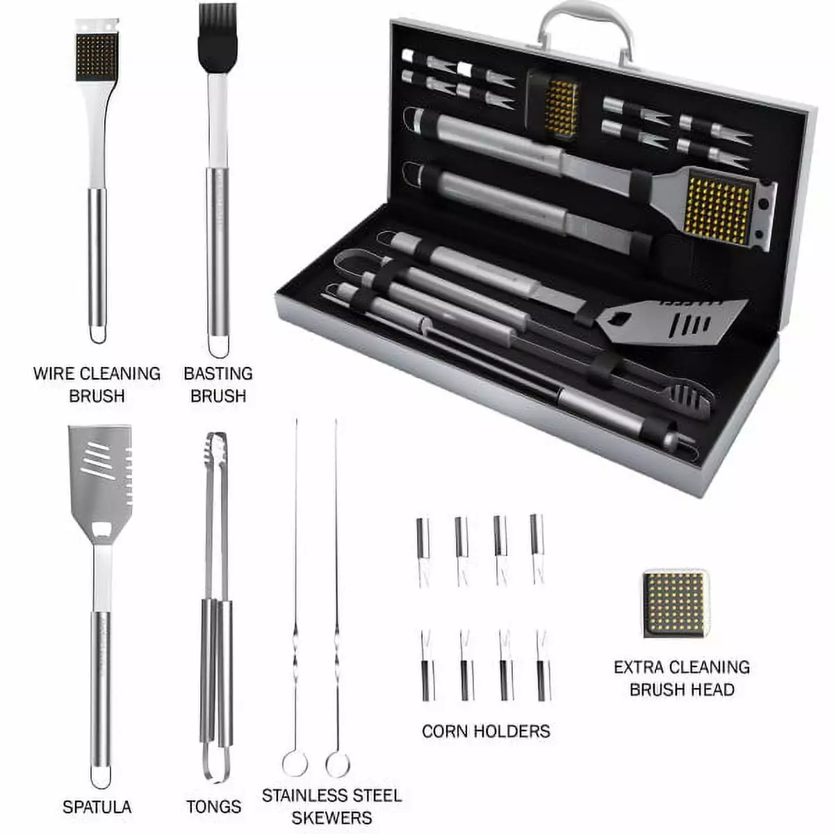 - 18-PIECE-SET – This 18-piece BBQ grill set has all the essentials you need for a summer cookout. including a spatula. tongs. 2 skewers. 8 corn holders. a wire cleaning brush with an extra brush head. a basting brush. and 2 non-stick grill mats.