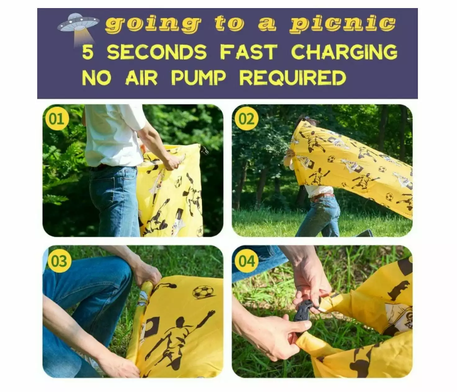 - INFLATE IN SECONDS: Skip the hassle of tiring. inconvenient air pumps and let your lounger inflate itself! Simply hold the inflatable beanbag against the wind and let it fill your lounger with air in just seconds. Then find yourself the perfect spot. lie down and enjoy! No wind No problem! Simply use a hair/leaf blower or hold it in front of an air-conditioning unit and voila!