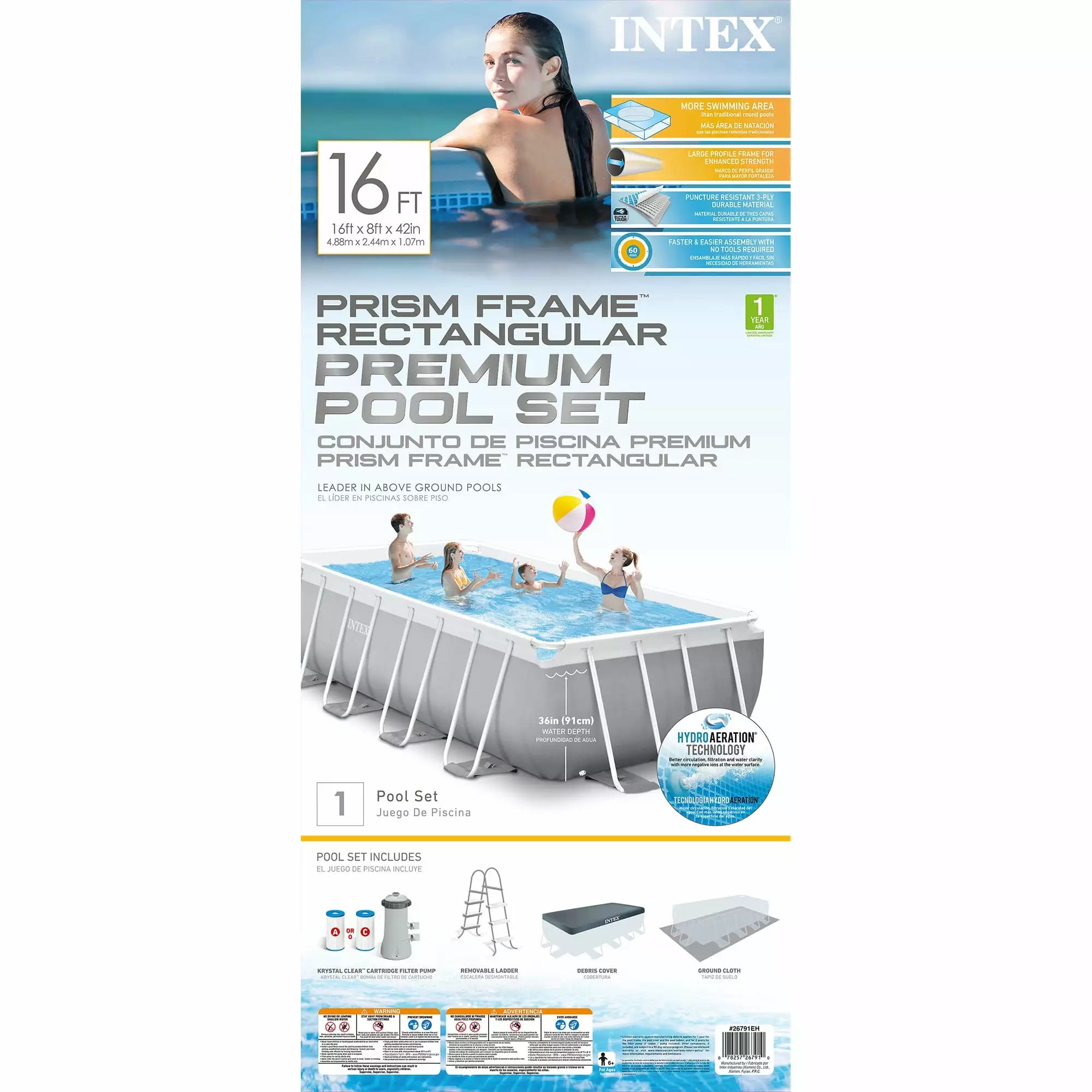 Intex 16ft x 8ft x 42in Prism Frame Rectangular Pool Set. The Prism Frame Rectangular pool is designed to fit any backyard. The pool is built to provide extra swimming space. and it holds more water than traditional round frame pool. allowing swimmers to appreciate the maximized swimming area. Constructed with puncture-resistant 3-ply durable material. the inside liner offers beautiful mosaic tile design. Wit a sophisticated look. Intex Prism Frame Rectangular pool will provide your family with endless summer fun! Hydro Aeration Technology is incorporated into the pump for improved circulation and filtration. improved water clarity and increased negative ions at the water surface. Constructed with puncture-resistant 3 ply material. Innovative new T-Joint – easy to assemble. no tools required. Includes 1.000 gal cartridge filter pump. pool ladder. ground cloth and pool cover. Approximate set-up size 16ft x 8ft x 42in. Water capacity 2.873 gal (90%.) Water depth: 36in. Ready for water in approximately 60 minutes. 1-Year Limited Warranty.