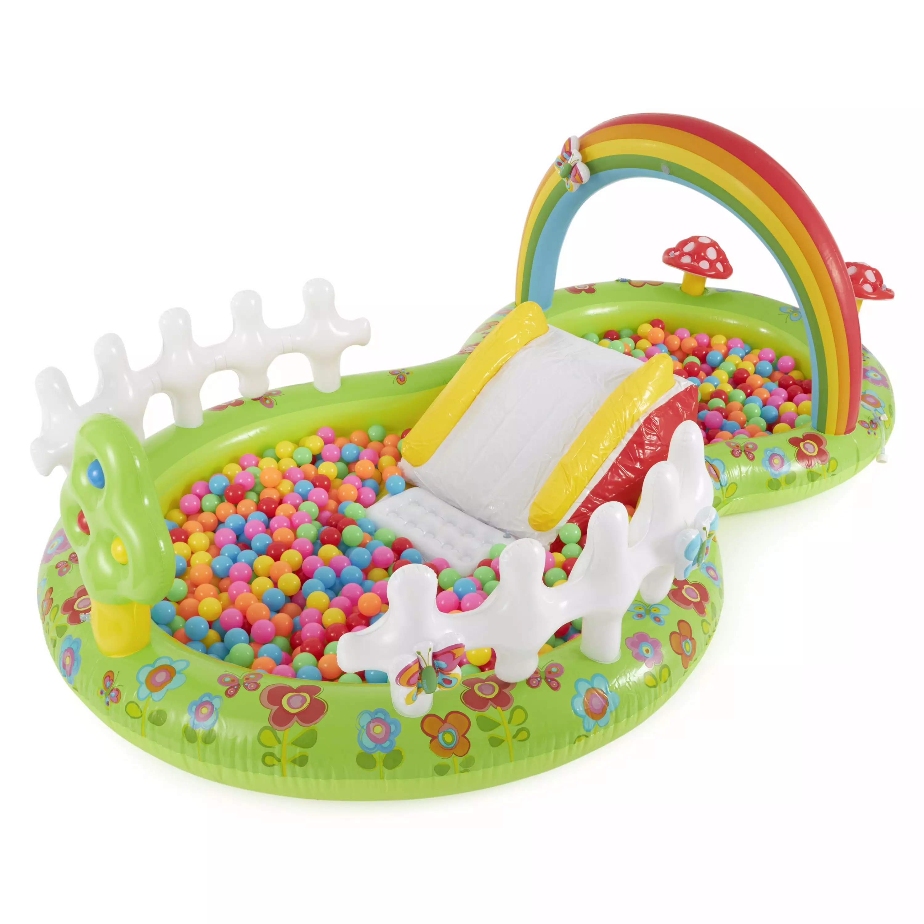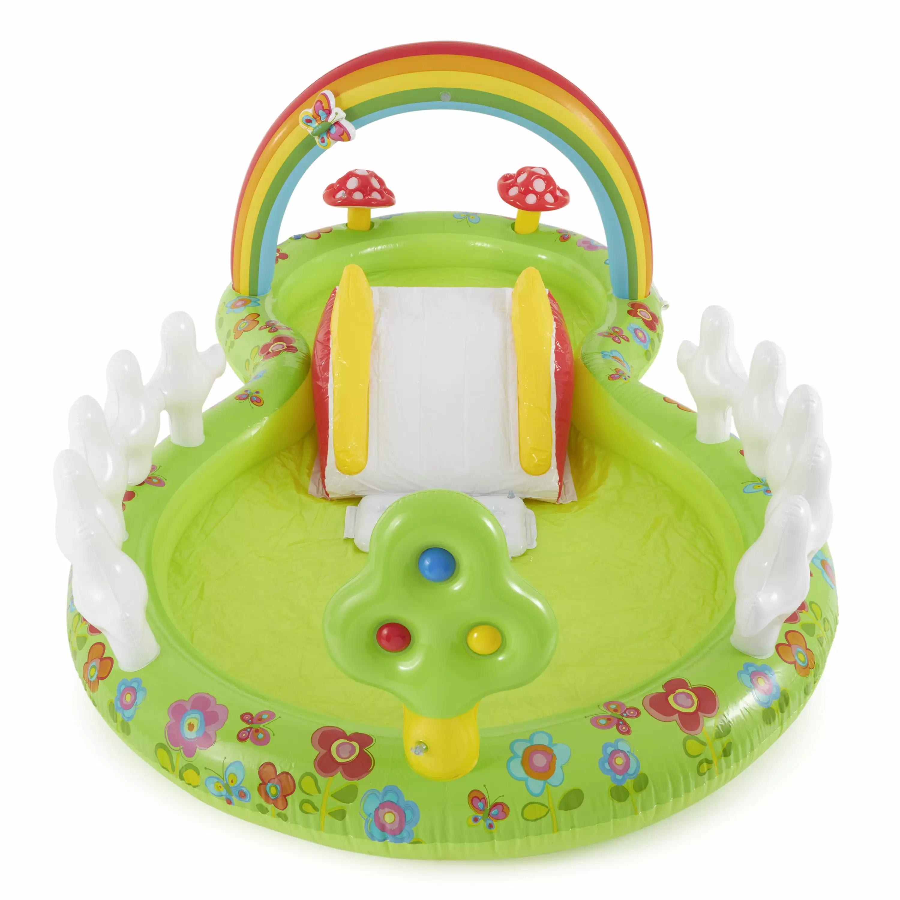 Intex My Garden Play Center-Splash away in this fun filled Garden Oasis. Includes two mushrooms. 4 butterflies and 3 Fun ballz(TM) Great for any summer get together for countless memories. Approximate inflated size 9ft 6in L x 5ft 11in x 3ft 5in H. Made with 12 ga vinyl. Built-in sprayer attaches to garden hose. Includes 2 mushrooms. 4 butterflies and 3 balls. Landing mat for extra padding. Capacity 5in of wall height: 119gal. 120 lb max weight limit. For Ages 2 to adult.