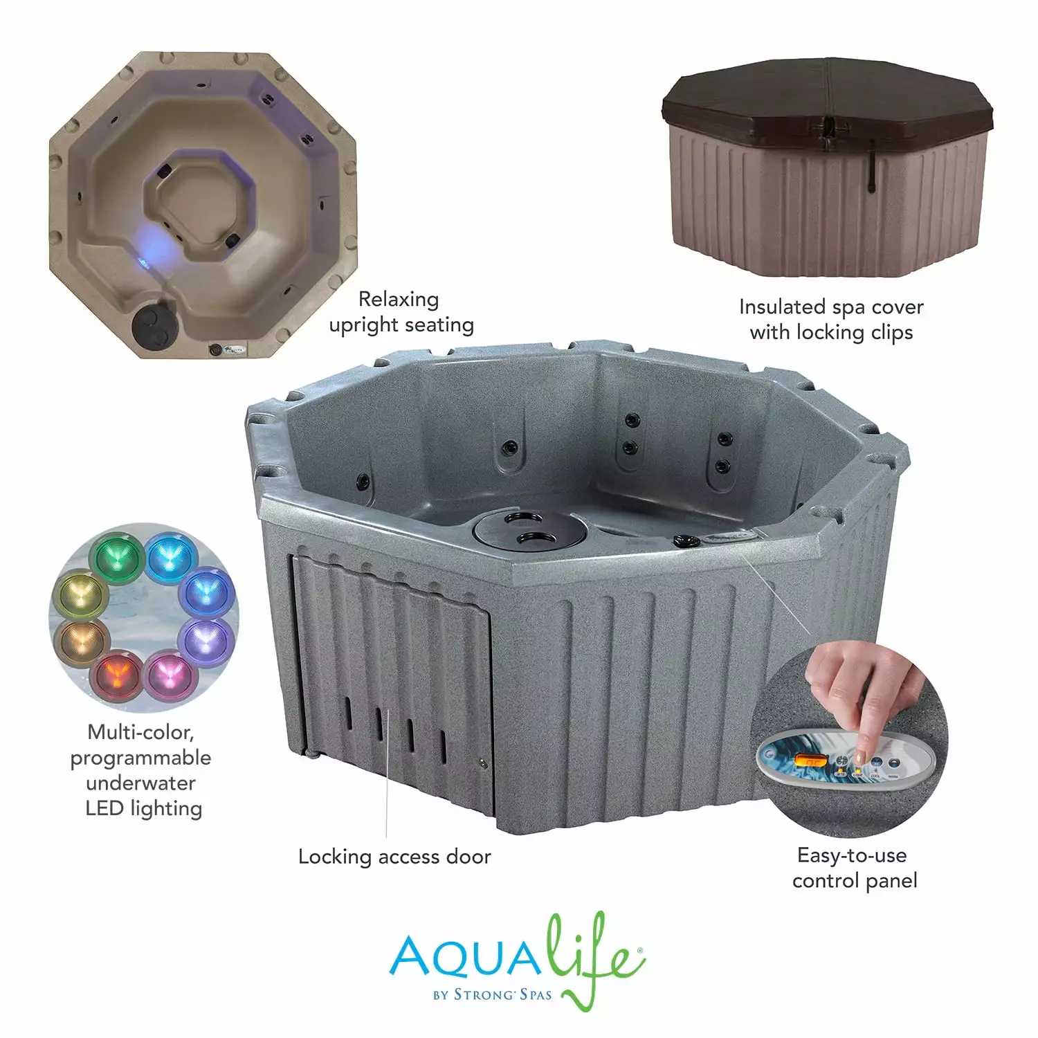 Step into the Aqualife Invi and step into your own personal oasis. The Invi spa’s resin construction makes it super lightweight and portable while still offering strength and durability. The Invi gives you luxury in a durable unit with a low maintenance. impact resistant exterior. All 11 hydrotherapy jets are powered by an energy efficient 2 Peak HP. 2-speed pump that allows you to melt away the day’s aches and pains with high speed hydrotherapy. Plug into any standard. dedicated 120V/15A household outlet and you’re ready to entertain. You also have the option to convert to a 240V electrical unit allowing your heater to perform at its maximum on the coldest days. which we recommend having professionally installed by an electrician. This molded spa is made from quality colored granite resin that features a fully insulated interior allowing your spa to retain optimum heat from your all stainless steel heater all year long. The Invi spa also comes with a heavy-duty. insulated tapered cover with locking clips allowing you to easily and comfortably close your spa while not in use. This product is delivered using a curbside delivery service.
