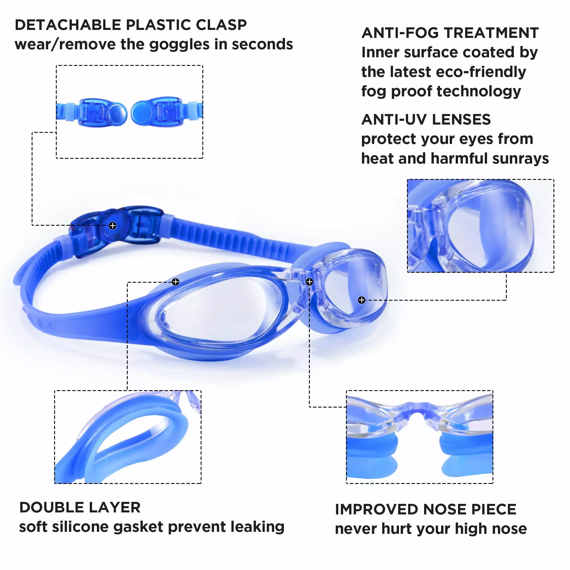 OUR SWIM GOGGLE FEATURES: Swim Glasses 100% U.V. Protection Soft Silicone cushions for comfort swimming goggles Anti-shatter. Anti-fog Coated Lenses Upgraded adjustable Head-Strap is more durable Easy Quick Release Clip-One Click Lock in the Back Strap adjustment is quick and easy.