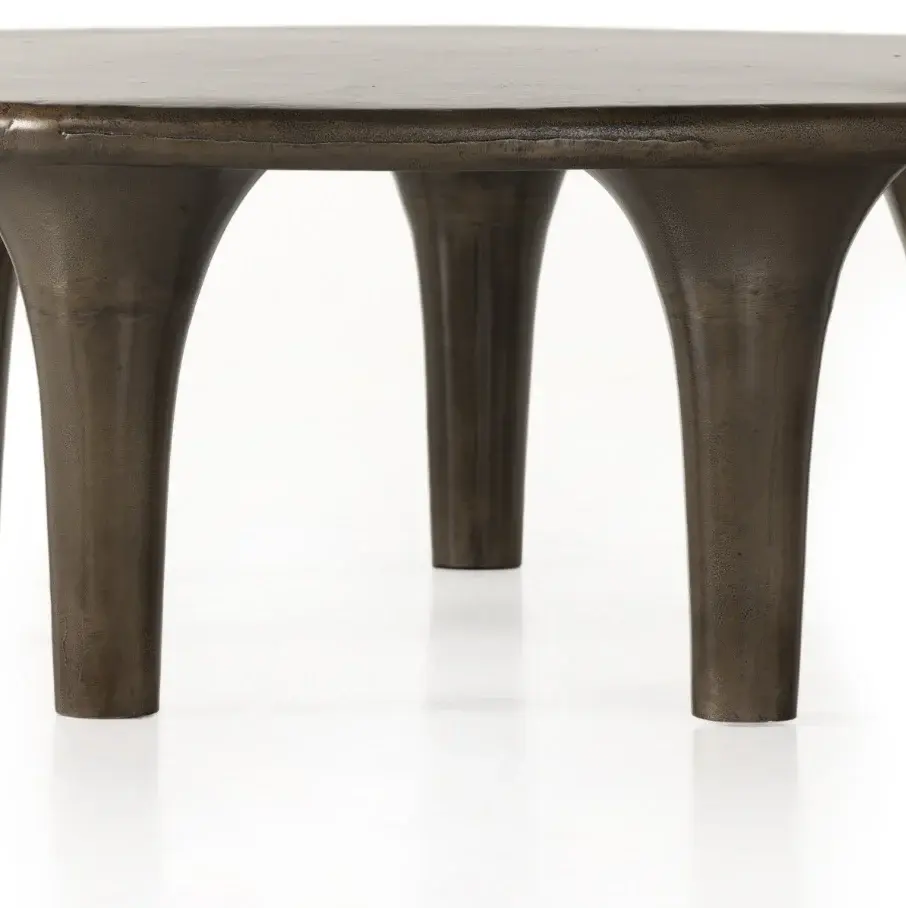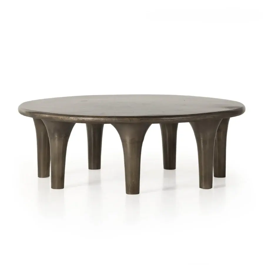 Finished in aged bronze, this seven-leg alloy coffee table pays a subtle homage to Brutalist design, bringing a touch of industrial chic to your living space.