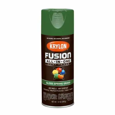 Fusion All-In-One. 12 OZ. Grass Green. Gloss. Spray Paint & Primer. Bonds To Difficult Surfaces Such As Plastics & Ready To Assemble Furniture Without Sanding Or Priming. Provides Maximum Rust Protection For All Outdoor Projects & Offers A Broad Colo
