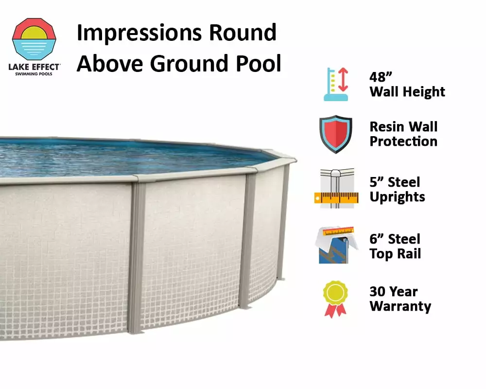 This Lake Effect Impressions Aboveground Steel Walled Swimming Pool is completed with a simple. warm-toned pattern perfect for admiring on sun-filled afternoons. Impressions offers the strength of steel with its 6 top ledges and 5 wide uprights and the protection of a resin coating allowing for you to enjoy your pool for years to come. They also include a skimmer and 20 gauge liner. It’s perfect for families who are looking to replace a pool and need to match the wall height to a deck. All of these Impressions Pools are resin coated with a resin protection and made in the USA.