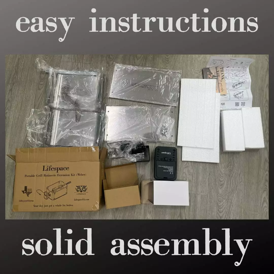 Introducing the Lifespace Go Anywhere Grill Rotisserie Extension Kit – the ultimate grilling companion for your Weber Go-Anywhere grill. Crafted with precision from top-notch stainless steel. this portable extension kit brings versatility and convenience to your outdoor cooking adventures. Designed to perfectly fit your Weber Go-Anywhere grill or fit on top of a conventional grid. our rotisserie extension kit takes your grilling game to a whole new level. Experience the joy of rotisserie cooking. right in the comfort of your own backyard or on the go. Whether you’re camping. tailgating. or simply enjoying a day at the park. this extension kit ensures that delicious. evenly-cooked meals are always within reach. Key Features: Superior Quality Stainless Steel: Our extension kit is built to withstand the elements and the rigors of outdoor cooking. The high-grade stainless steel construction guarantees durability. heat resistance. and corrosion resistance. ensuring it remains your reliable grilling companion for years to come. Portable and Easy to Use: Don’t let cumbersome equipment hold you back. This extension kit is designed with portability in mind. making it effortless to transport and set up with 4 simple bolts wherever your grilling adventures take you. No need to compromise on your culinary desires when you’re away from home. Multi-functional Design: Beyond its rotisserie capabilities. our extension kit also doubles as a wind shield. Say goodbye to battling gusts of wind that disrupt your grilling process. Enjoy steady. consistent heat for perfectly grilled dishes every time. Universal Fit: Worried about compatibility Fear not! The Lifespace Go Anywhere Grill Rotisserie Extension Kit is designed to fit on top of any large grid. Whether you have a charcoal or gas grill. you can easily elevate your cooking with this versatile accessory. Elevate Your Grilling Experience: Indulge in the succulent flavors of rotisserie-style cooking. Impress your family and friends with mouthwatering roasts. juicy poultry. and perfectly charred kebabs. Turn your outdoor gatherings into unforgettable feasts with the help of our extension kit. Don’t let the size of your grill limit your culinary creativity. With the Lifespace Go Anywhere Grill Rotisserie Extension Kit. the possibilities are endless. From flavorful rotisserie delights to the practical wind shield feature. this extension kit is designed to enhance your grilling experience and elevate your meals to a whole new level of deliciousness. Join countless satisfied grill masters and take your outdoor cooking to new heights with the Lifespace Go Anywhere Grill Rotisserie Extension Kit. Unlock the true potential of your Weber Go-Anywhere grill and enjoy the taste of success at every gathering. Embrace the freedom of portable. versatile grilling today! Packaged Dimensions: 14in x 5in x 8 in Weight: 7lbs What’s in the Box: 1 x Lifespace SS Rotisserie Extension Box 1 x Lifespace Rotisserie Motor 1 x Lifespace USB Adapter 1 x Lifespace Rotisserie Shaft & Prongs 1 x Rotisserie Bracket & Round Bush 6 x Screws 1 x Assembly Instructions