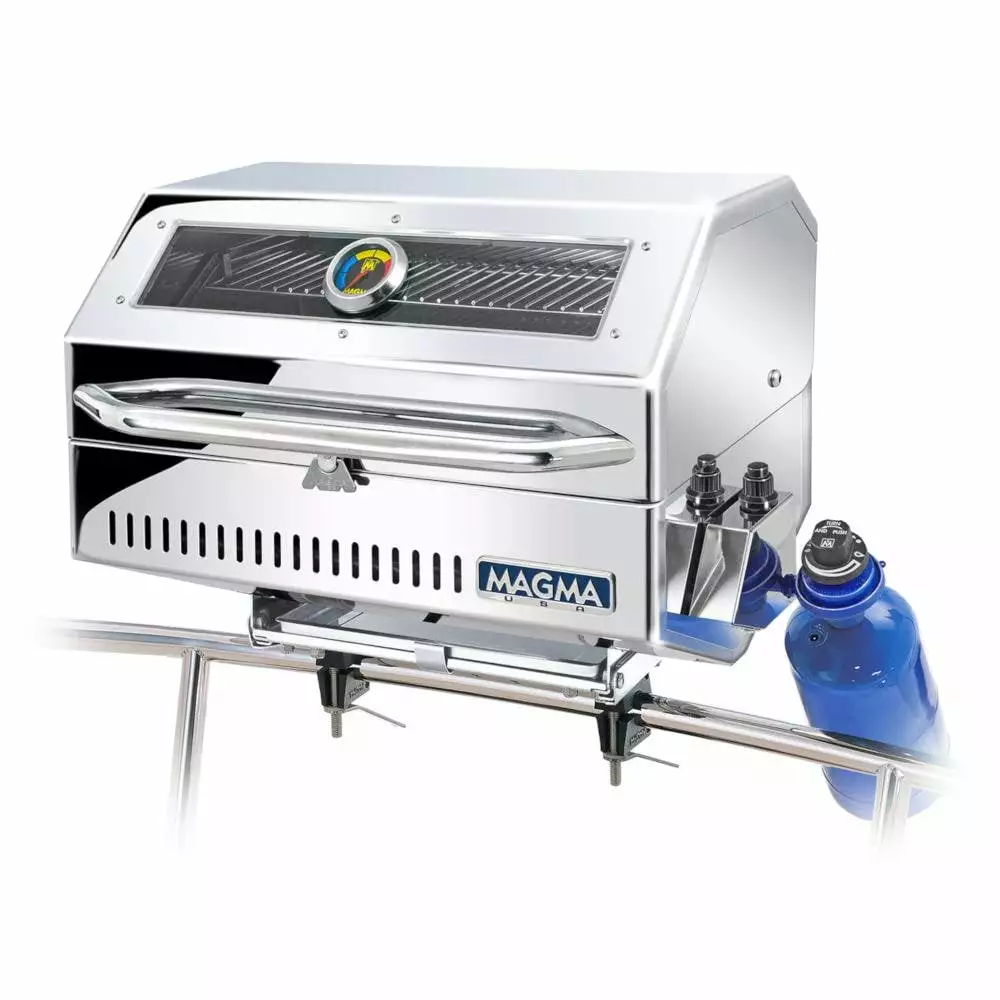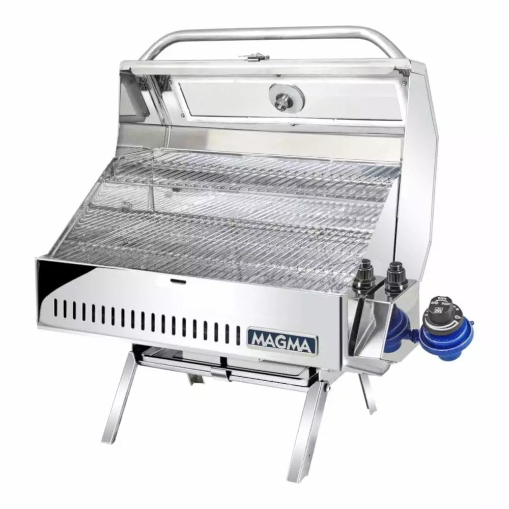 Perfect your grilling skills with Magma’s Catalina II Infrared Gas Grill. The perfect addition for feeding a large crew on board your boat. Features include: 18-8 mirror-polished stainless steel construction. redesigned combustion system that keeps the grill lit even in heavy winds. a hermetically sealed thermometer. a dependable electronic ignition system. powered by a single AAA battery (included). and an ultra high-temp glass viewing window. Anti-Flare Infrared technology produces intense. evenly distributed heat. eliminating Flare-Up and immediately emulsifies drippings giving your meal a great smoky flavor. The primary and secondary grilling surfaces give you the option of searing. slow cooking. or warming. Equipped with fold-away table top legs. The swiveling control valve/regulator. designed to use 1lb. disposable propane fuel canisters. allows for quick. safe fuel canister exchanges or easily adapt grill to existing on-board low pressure propane (LPG) or natural gas (CNG) fuel systems. Heavy Duty mounting hardware is recommended.