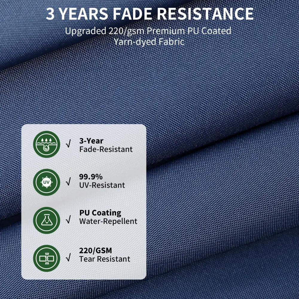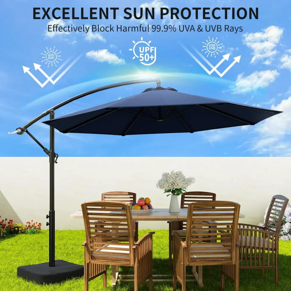 The 10ft offset patio umbrella is made of 220gsm yarn-dyed fabric with PU coating, providing exceptional sun protection and water repellent. This advanced canopy is built to last for up to 3 years without fading, making it an ideal choice for any outdoor space.