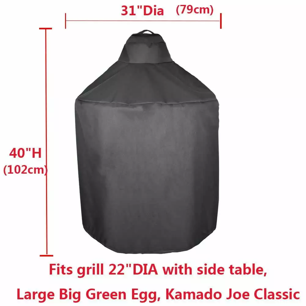 Mini Lustrous Covers Protect Your Grills All Year Around. Extend The Lifetime of Your Grill Features: Protects Grill against rain. dust. dirt and pollen and can also be used during the winter even in harsh weather conditions. There are ANTI-RUST metal eyelets at the bottom. so the cover can be fastened to the grill legs which offers a better wind protection. Made of high-quality 600D Oxford fabric with PU coating. the cover provides great protection against the elements. Specifications: Compatible Model: Large Big Green Egg Dimensions: 31"Dia X 40"H Material: 600 Denier Oxford Fabric with PU Coating Color: Black Package Contents: 1 x Grill Cover Notes: – The grill cover is not designed to entirely cover wheels or legs. – Please do not place the grill cover on the hot grill until the grill has been cooled down. – The cover is not fireproof. Please keep away from open flame and other sources of ignition.DESIGN FOR LARGE BIG GREEN EGG: Fits grill 22 diameter with fold down side tables 40 high (Large Big Green Egg. Kamado Joe Classic and others). Please check your grill’s dimensions for proper fit.PREMIUM MATERIAL: Heavy Duty 600D Oxford Fabric with PU Coating Which is waterproof. tearproof and fade resistant high-density stitching for durability.WEATHER RESITANT: Protects Grill against rain. snow. sunlight. night moisture. dust and other elements. can also be used during the winter even in harsh weather conditions.ANTI-WIND DESIGN: Rust resistant metal eyelets around the edge help you to fasten the cover tightly and securely within heavy windy days.CONVENIENT HANDLE: Stury handle makes removal and adjustment of your cover easily and hassle-free. Easy to clean: Hose it down with water. dry up the grill cover in the sun for next use
