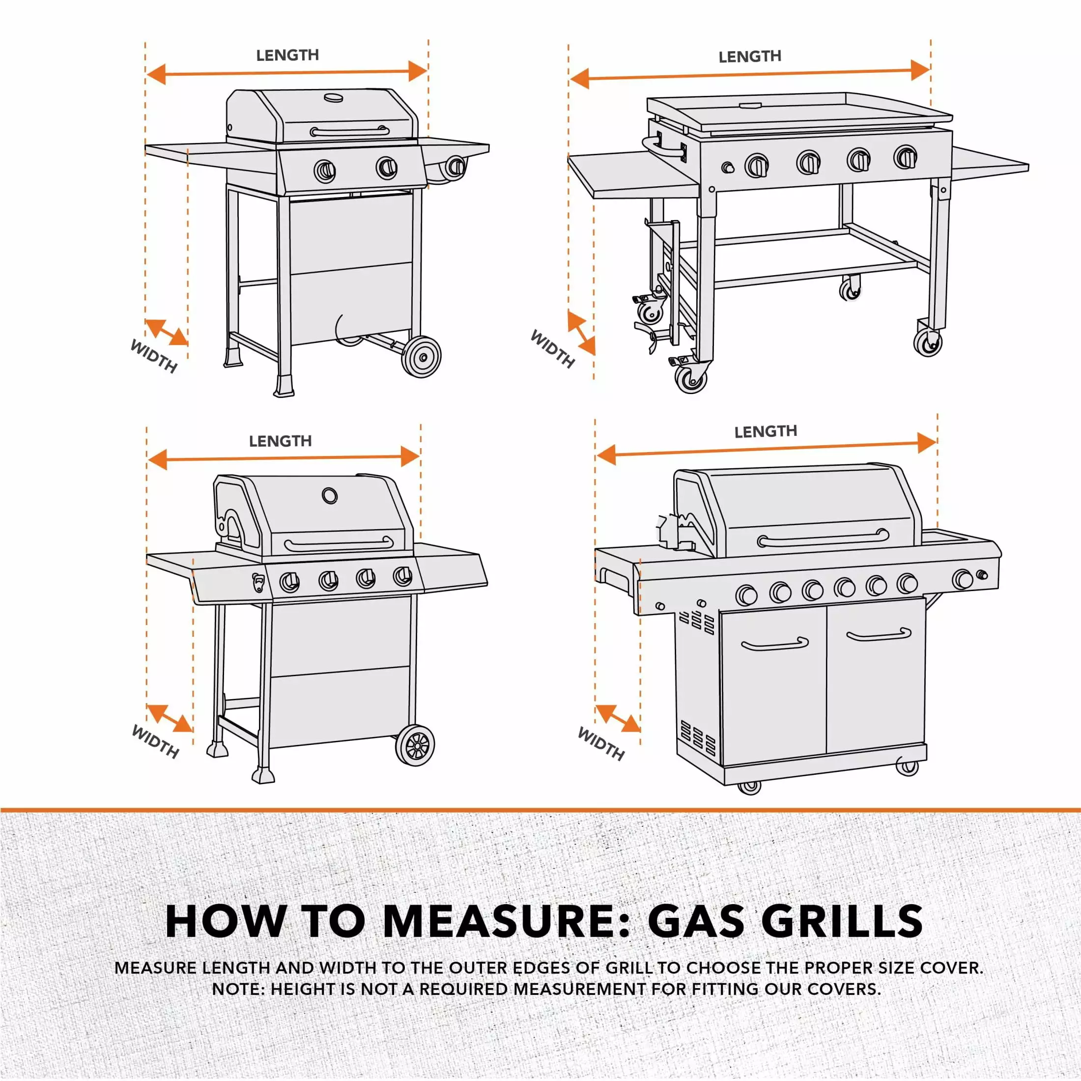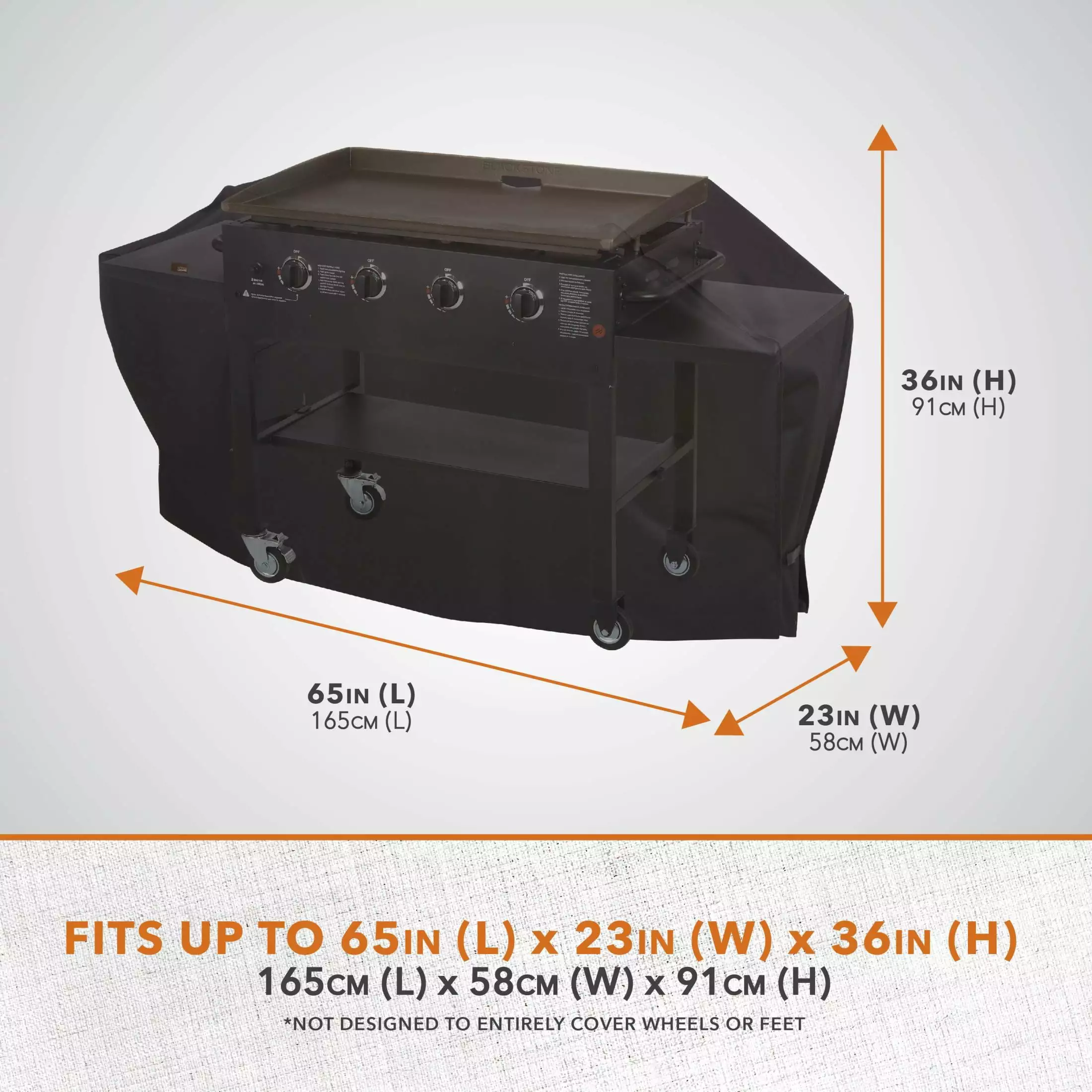 - Patio Griddle Cover: Fits most patio griddles up to 65-inches long x 23-inches wide x 36-inches high.