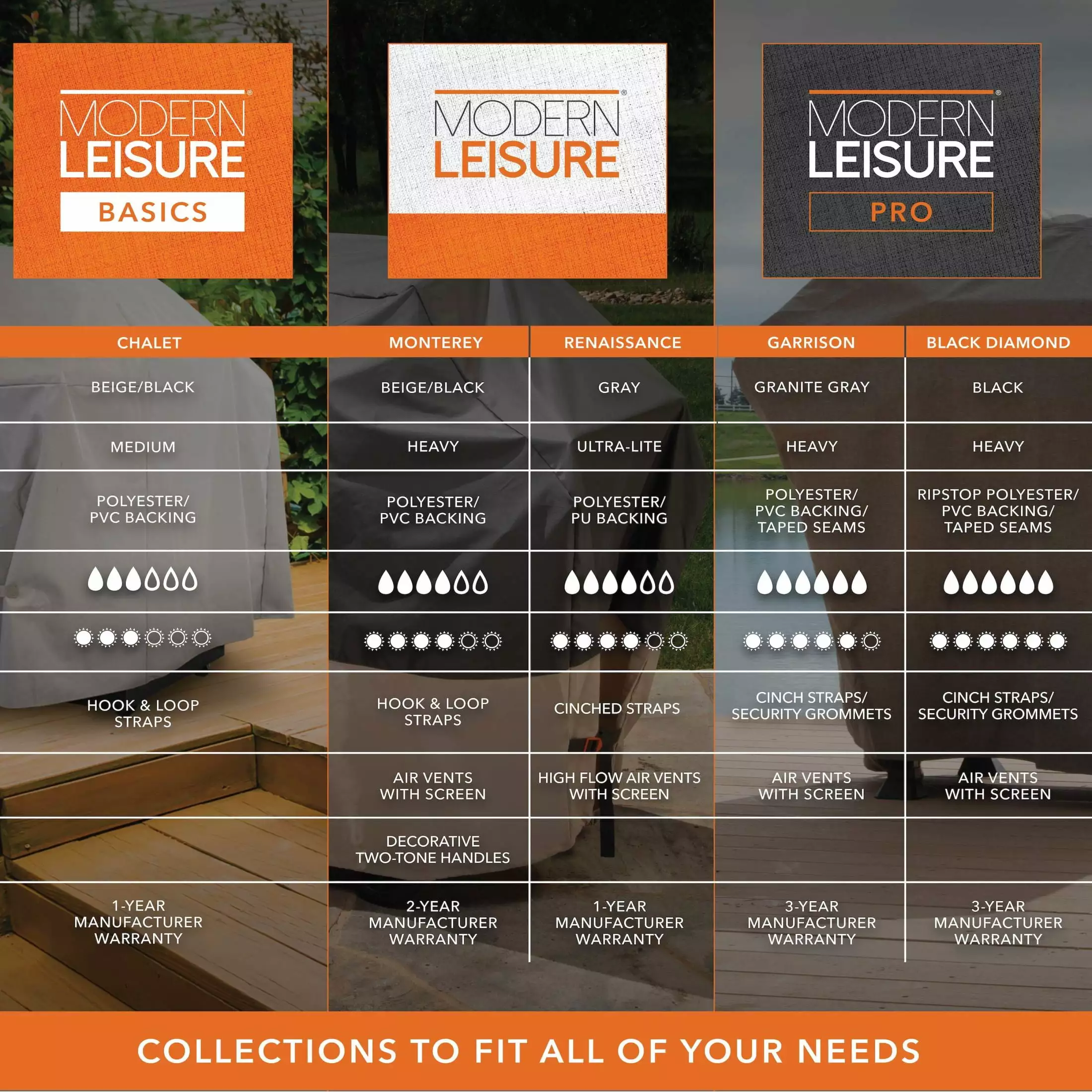Designed and tested a mile above sea level. Modern Leisure Patio Furniture Covers stand up to the harshest weather elements the Rocky Mountains have to offer. The Monterey Patio Griddle Cover features a stylish aesthetic. complimentary with any outdoor setting. designed to keep your patio grill clean and protected year after year. Heavy-duty. weather-resistant material provides interior binding to help keep the elements out while leg buckles provide a fast and secure fit. Loaded with features. the Monterey Collection provides a 2-year manufacturer warranty. Related part number is 3026.