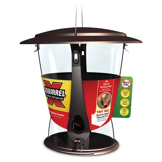 Feed Birds. Not Squirrels! The X2 Squirrel-Proof Bird Feeder features two way squirrel protection. Stylish tapered design with decorative brushed copper finish & locking metal roof. Functional roof tilts when stepped on by a squirrel to close both ports. Two integrated metal perches are spring loaded to close both ports with pressure from a squirrel. Wide mouth design offers easy fill. Base is removable for easy clean. Seed allocated evenly to both ports. no more empty ports.