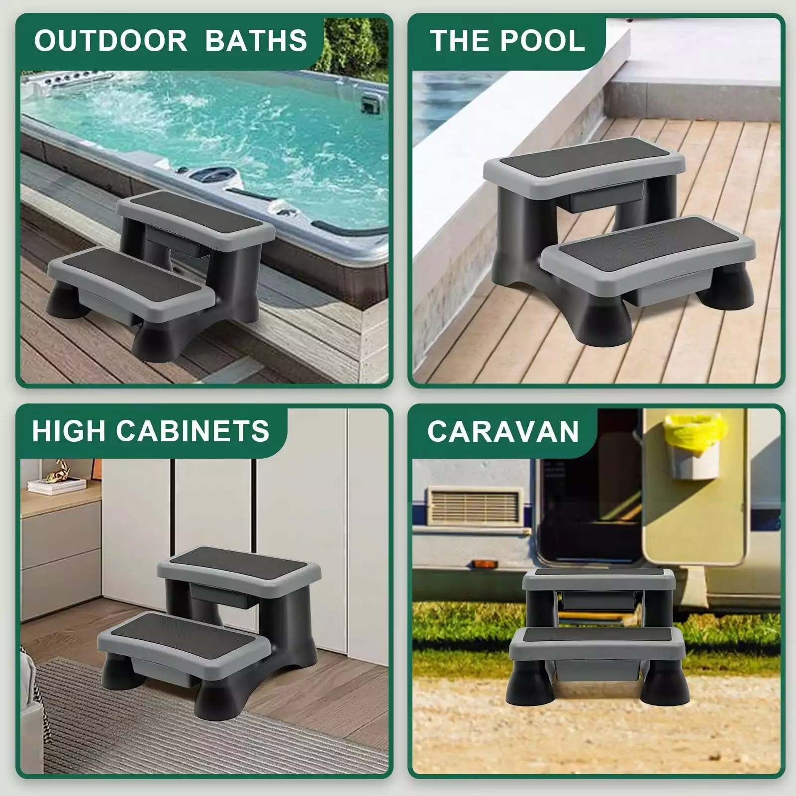 NAIZEA Universal Spa & Hot Tub Outdoor 2-Steps No Slip .Weather Resistant with Storage Drawers.The material sustains weight. impact. and harsh weather. making them a welcome indoor and outdoor presence. The ridged surface provides a comfortable safe grip so that you’ll be secure going up and coming down. The non-skid tread prevents slipping. even when the stairs are wet. The plastic is low-maintenance. too. so you won’t need to treat the surface to protect from water. as you would with wood based hot tub accessories. The tough yet light material makes these steps easy to transport. and resistant to water.