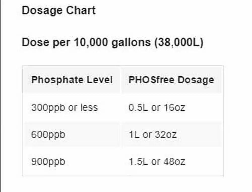 Reducing phosphate levels in pools is easy with Natural Chemistry’s patented PHOSfree technology. PHOSfree is formulated from lanthanum (rare earth) compounds. When added to the skimmer. a thin coating of PHOSfree forms on the filter media. As pool water flows through the filter. phosphates are reduced to a very low level. PHOSfree Instructions This product is designed for use in properly balanced pool water. 1. Clean or backwash filter. 2. Determine appropriate dose. * See chart below. 3. Shake bottle well prior to application. With circulation pump running. add dose to skimmer. 4. Run filter for 48 hours continuously without backwashing or cleaning. 5. After 48 hours of filtering. clean/backwash filter. Retest phosphate levels. and if necessary. repeat steps 1-5. Note: If DE filter pressure rises to 10psi above start-up pressure. turn pump off for 1 minute and then turn it back on. If pressure remains high. backwash or rinse for 30 seconds. For DE & Cartridge Filters: Do not add more than 1.5L (48oz) at a time. If more than 1.5L (48oz) is needed to treat. be sure to clean or backwash the filter between treatments. Important: Algae must be treated prior to testing and lowering phosphates. Chlorine must be under 5ppm before testing phosphates. Weekly Maintenance Dosage 1 cap (4oz) per 8.000 gallons