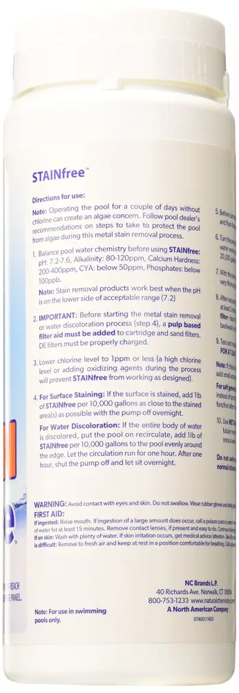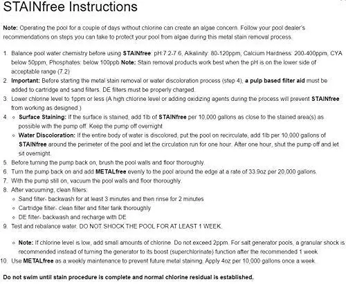- Compatibility: Stainfree provides versatile stain treatment for all pool surfaces and activates seamlessly with any sanitizing system, ensuring comprehensive stain removal and pool surface care.