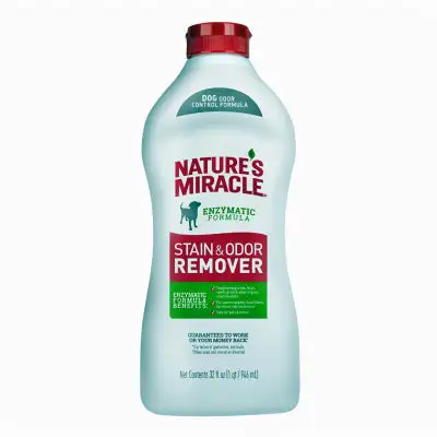 Nature’s Miracle Stain & Odor Remover Nature’s Enzymatic Formula works to eliminate stains and odors caused by puppies and dogs. including urine and feces accidents. food. drooling. bedding stain and odors and other hard-to-get-out dog messes. Note: Not recommended for leather. suede. silk or wool specialty fabrics. When used as directed. this product will also work on old deep-set stains and odors. Safe for use around pets and homes. when used as directed.
