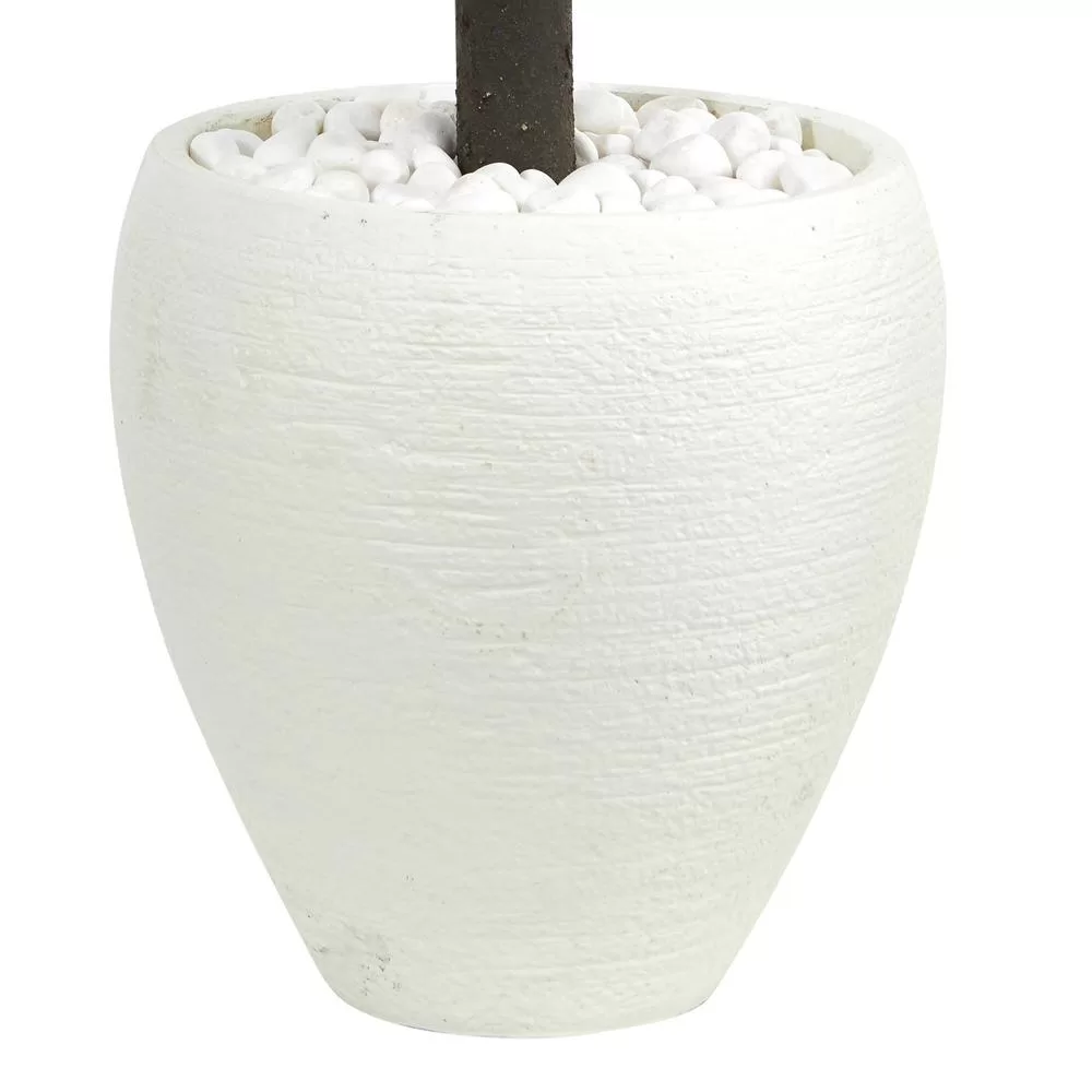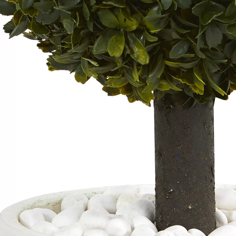 The boxwood topiary artificial tree features one sphere shaped green foliage that will keep its shape and luster without maintenance. It comes in a white oval planter with natural rocks, which is the perfect color to brighten up and give a room a new clean look. Though, when placed in the protection of a sunroom, the rays of the sun will make the lifelike green leaves shine brilliantly.