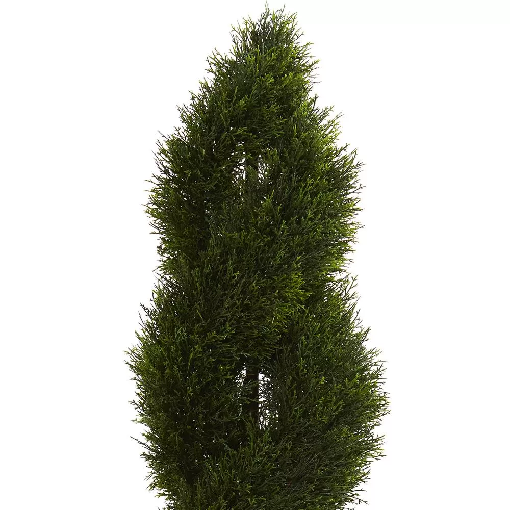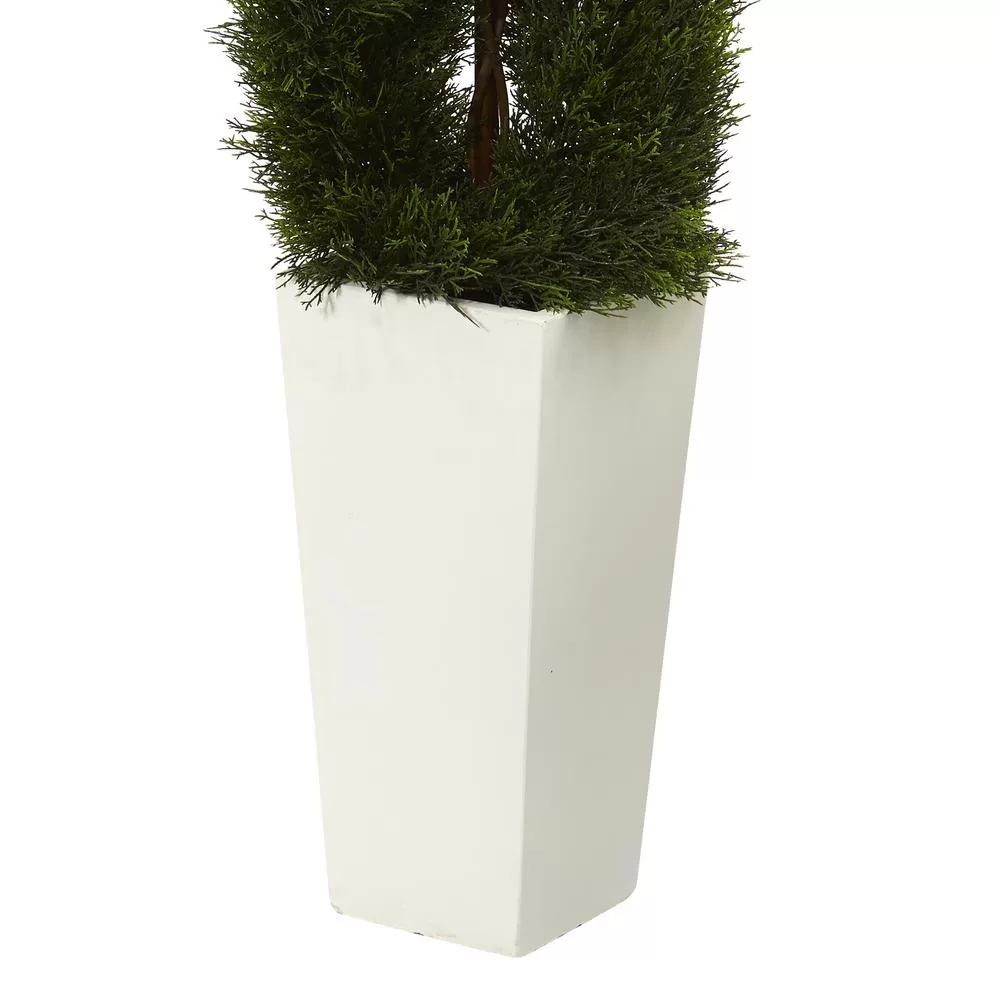 2-spirals of lush, plush green foliage encircle each other, rising up around a lifelike stem. This artificial double cypress spiral topiary is expertly made to look authentic in its white tower planter. It makes for eye-catching wintertime decor at your entryway. Pick up a pair to flank your door. UV resistant so perfect for indoor or outdoor use.