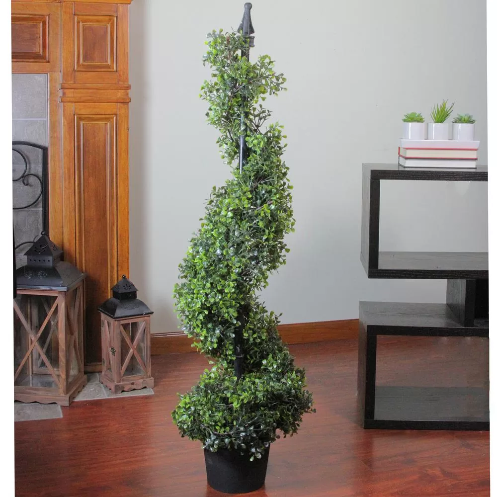 The classic elegant shape of this topiary is sure to attract attention. Ideal for reception areas home and office display. 558 leaves. For indoor display only. Comes in a weighted pot. Dimensions: 46.5 in. H x 11 in. W x 11 in. D. Material(s): plastic.