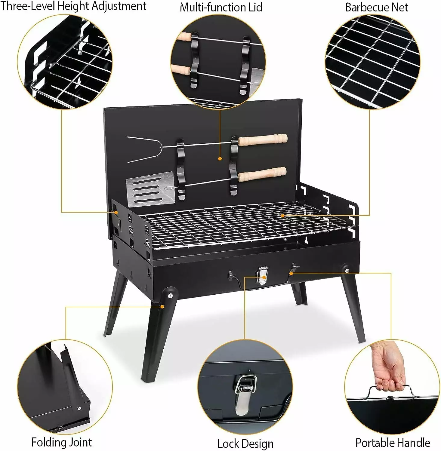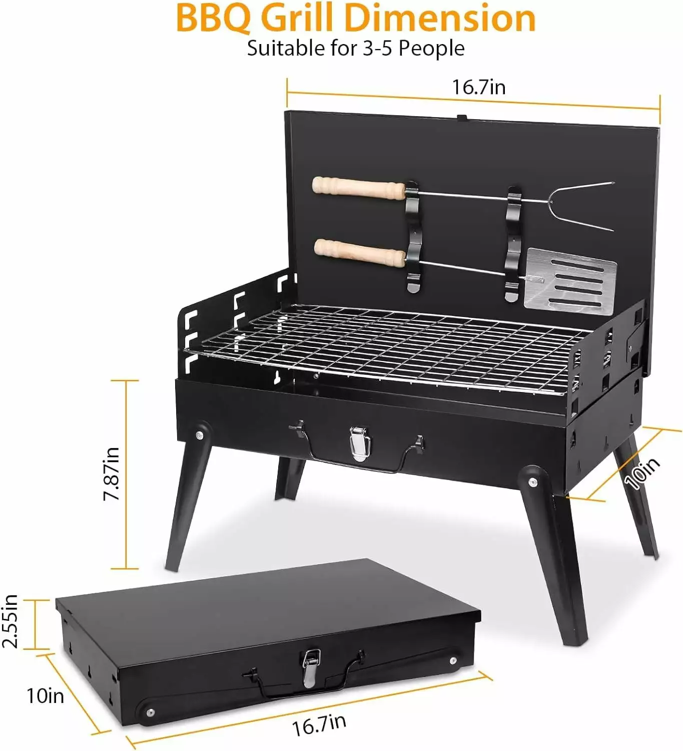 Sturdy four-Leg Support -Stable The four tripods stand up stably. so there is no need to worry about the grill falling over. Simply unfold the legs. and you’ll have a stable. lightweight. and portable outdoor grill ready. Comes with Premium Lid & Metal Handles The lid locks tightly to the bowl so it’s easy to move from place to place without making a huge mess. Free Barbecue Accessories Our barbecue grill charcoal includes a wealth of grilling accessories to give you a better grilling experience without the need to purchase additional tools. (Since they are just a gift for you. please buy them separately if you mind their quality.) Portable barbecue charcoal grill is wonderful gift for outdoor camping. backpacking. parties. beach cooking. etc. It’s perfect to cook delicious food on our portable BBQ grill like burgers. fish. vegetables. steak. hot dogs. corn and more. Specifications: Portable barbecue charcoal grill Dimensions: Overall dimensions :17.32 x 10.63 x 18.5 inches Folding size: 17.32 x 10.63 x 2.68 inches Material: Metal Color: Black Package List: 1 x Portable Folding Camp Grill