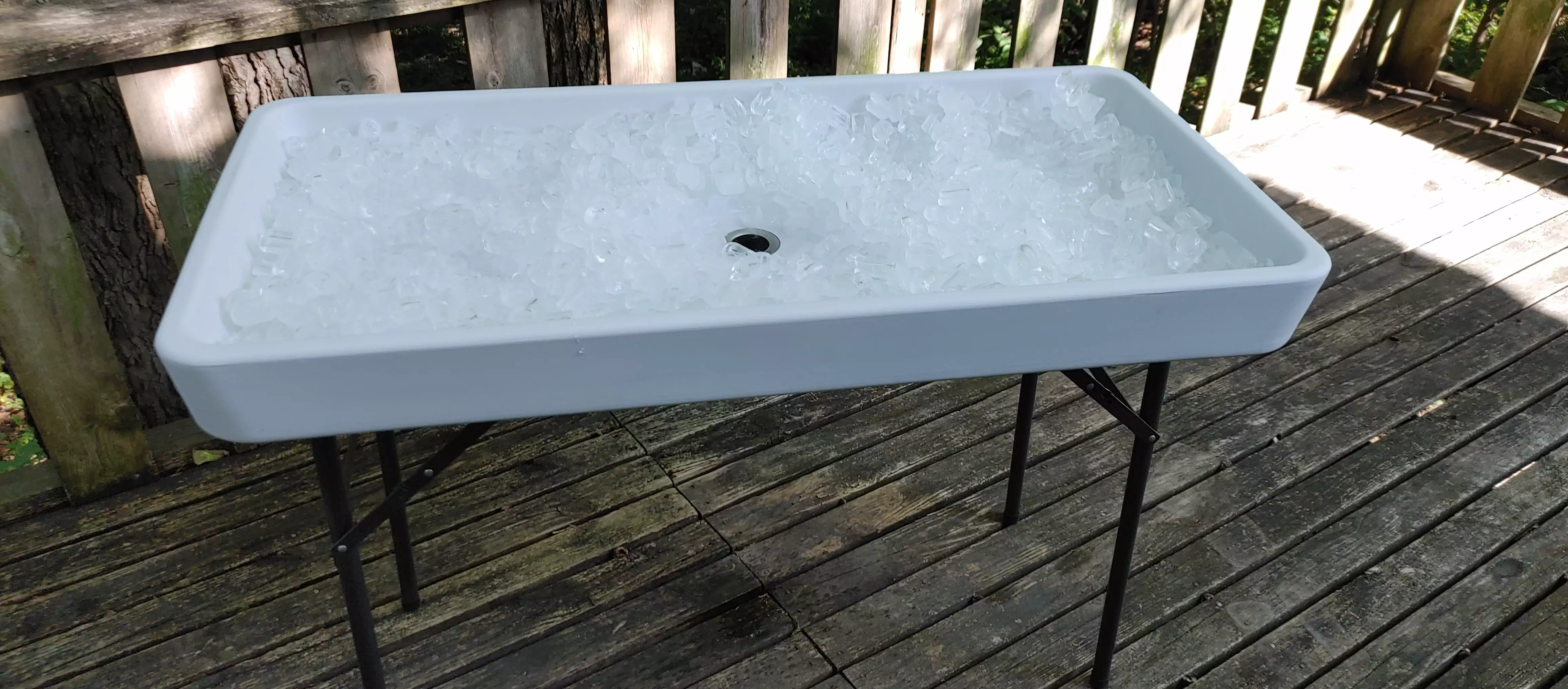This 4-Foot Fill N Chill Table as an innovative design can be used for so many different functions. Ideal as an open top cooler. or can be used for a variety of cleaning applications. The center drain prevents water build up. and the heavy duty plastic is long lasting and cleans easily. No tools required; simply lock the hinges in place. Assembled Dimensions: 49.8"Lx25.6"Wx37.2"H.Organized Fishing 4-Foot Fill N Chill Table