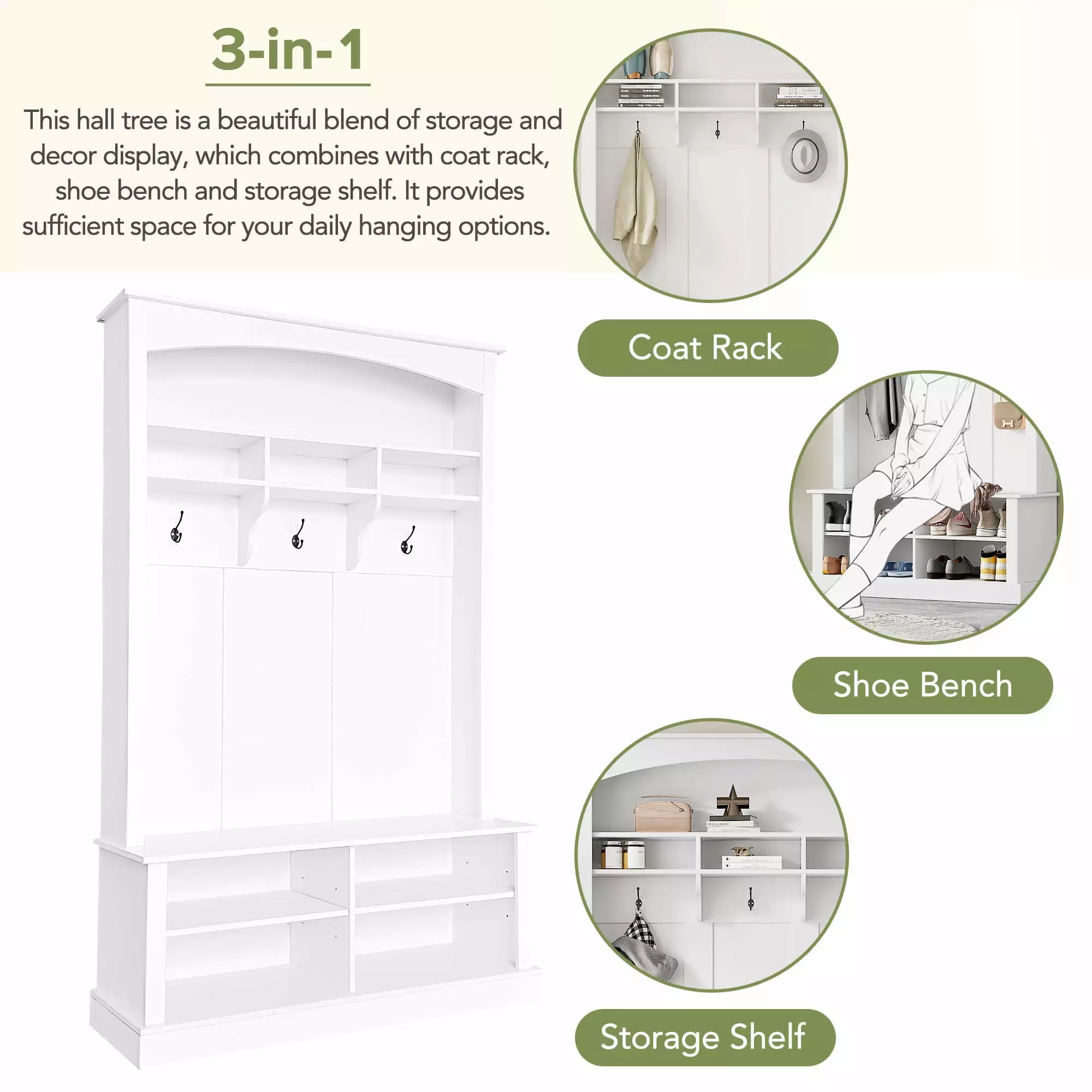 3-in-1 This hall tree is a beautiful blend of storage and decor display. which combines with coat rack. shoe bench and storage shelf. It provides sufficient space for your daily hanging options. The comfortable bench is convinent for changing your shoes. while the 4 extra lower shelves can be used to store your shoes. bags and other accessories. Sleek Design With its clean lines and multi-grid design at the bottom. this hallway storage bench is a modern minimalist entryway furniture piece. The arc shape of the panels beside the hooks also add a touch of elegance to the whole look. Adjustable Shelves The storage compartment below the bench has 2 adjustable shelves. allowing for customization to accommodate different size and style of shoes. By adjusting the shelves. you can optimize the use of space within the cabinet. This is particularly useful for limited space in hallway or foyer. Sturdy Construction Crafted with premium particleboard and hardware. the surface of the shoe bench is strong enough to support up to 198 lbs. ensuring long-lasting use and stability. Product details Product Type Hall Tree Top Color White Top Material Particle Board Top Finish Application Veneer Base Color White Base Material Particle Board Base Finish Application Veneer Weight Capacity Overall: 416LBS / Bench: 198LBS / Hook: 3.3LBS Detailed Measurement Overall: 47.2”W x 15.7”D x 75.3”H Country of Origin China Top Thickness 0.59inch Level of Assembly Full Assembly Needed Suggested Number of People for Assembly/Install 2 Estimated Time to Set Up 1.5 h Adult Assembly Required Yes Additional Tools Required (Not Included) Power Drill Recommended